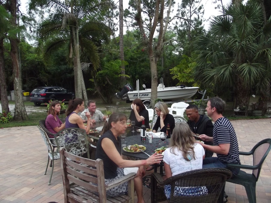 All enjoying food around two tables