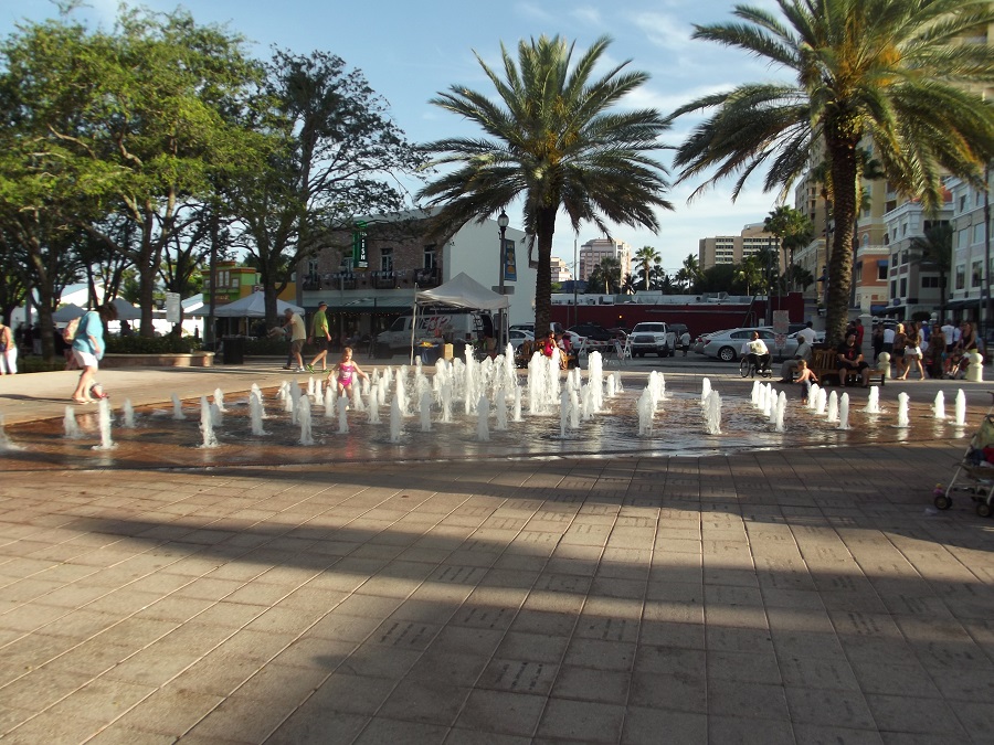 Dorothy and Carol at memorial square with triangular set of fountains in Palm Beach County, FL
