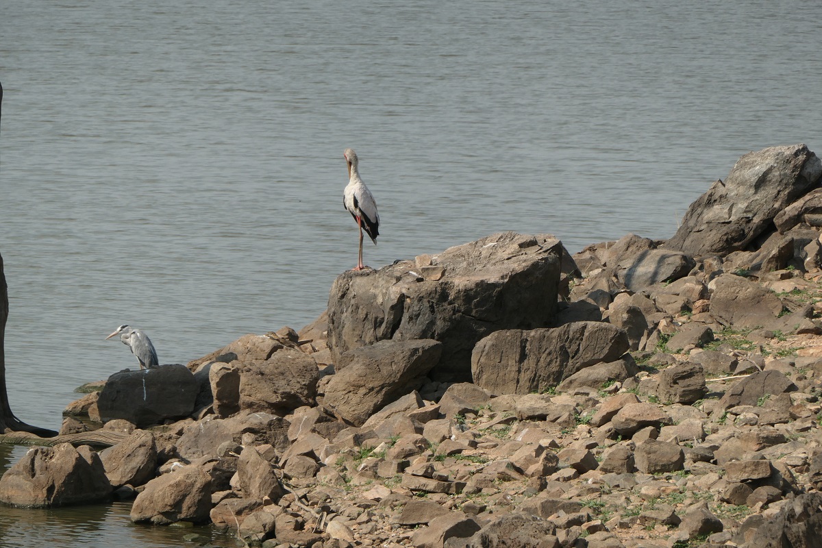 Grey heron, yellow-billed stork