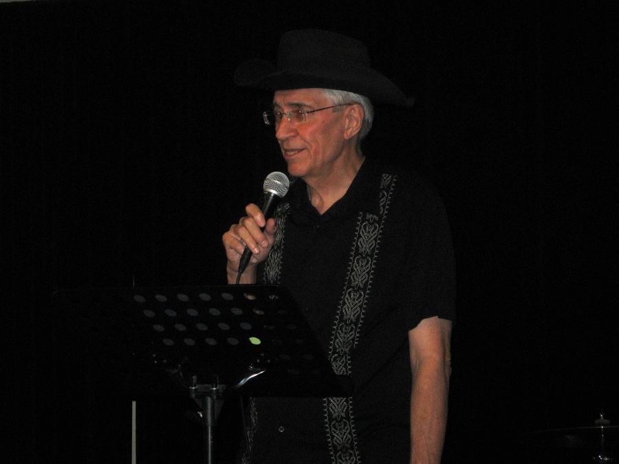 Tom singing with black hat on