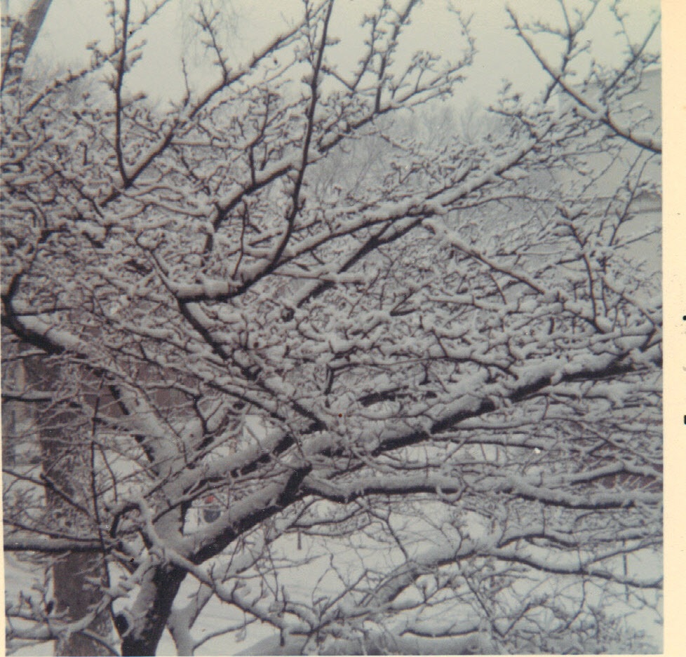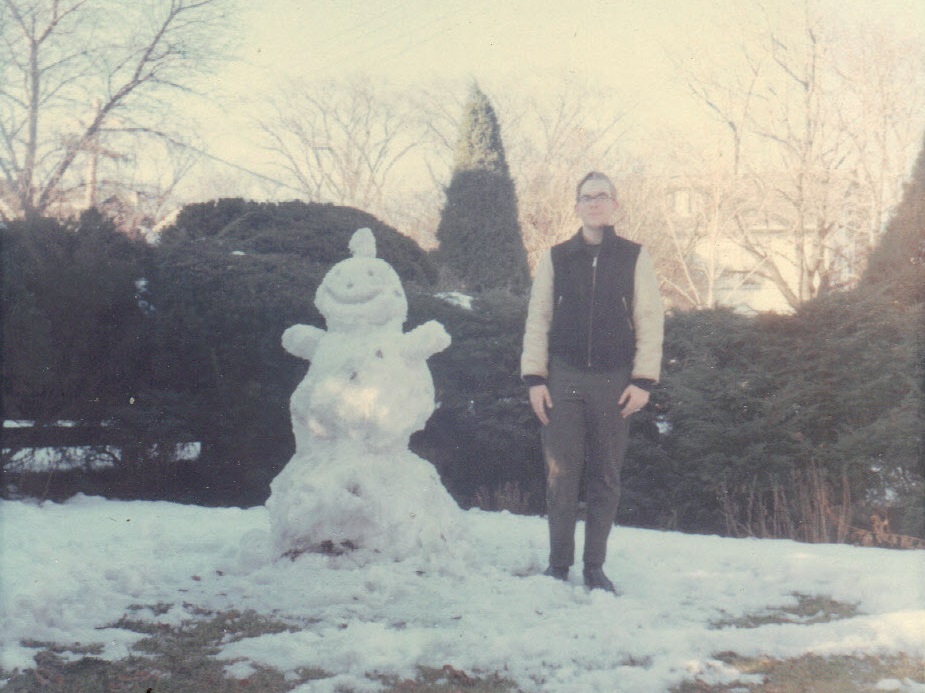 Andy with snowman at 2662 Orrington, Evanston, IL -- winter, 1967
