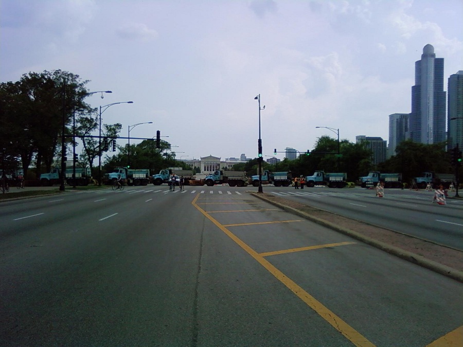 Many snowplough trucks lined up accross Lake Shore Drive about 2 blocks north of the Field Museum