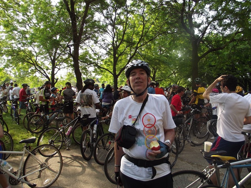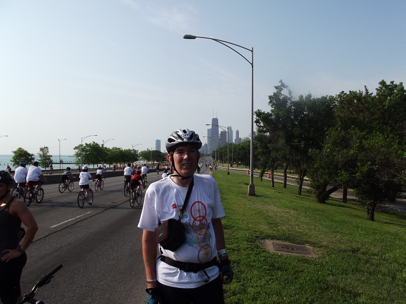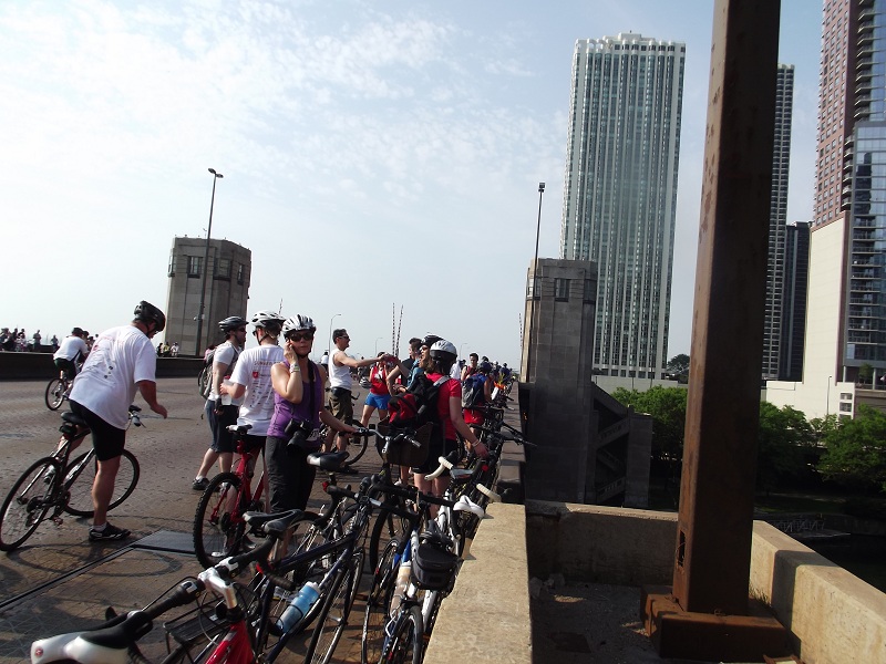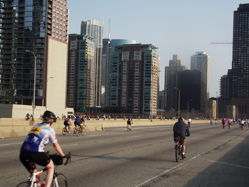 Heading south again with great view of Hancock and Lake Point Tower over MANY cyclists