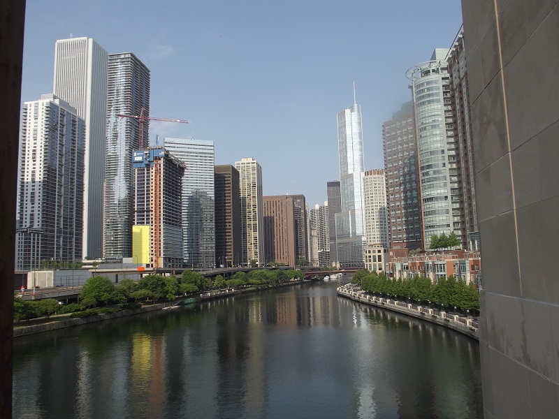 Reflections in the Chicago River from the LSD bridge looking west -- much later with more sunlight
