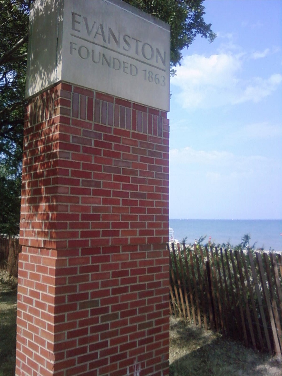 The pillar marking Evanston along Sheridan Road at South Boulevard Beach