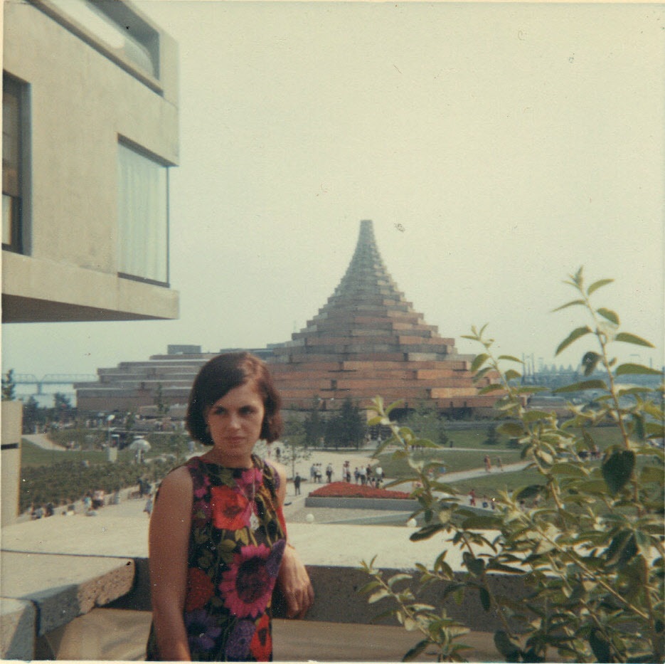 Tall wooden tower, attractive lady, at Habitat 67