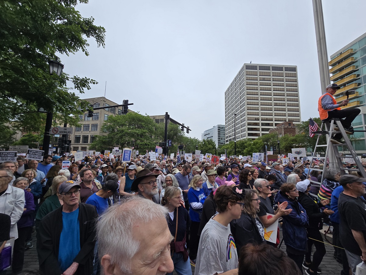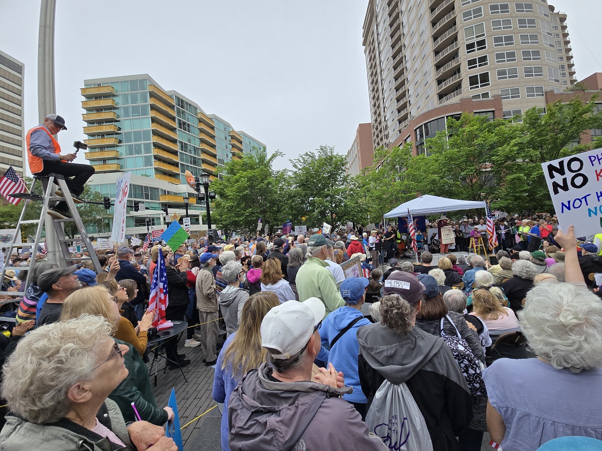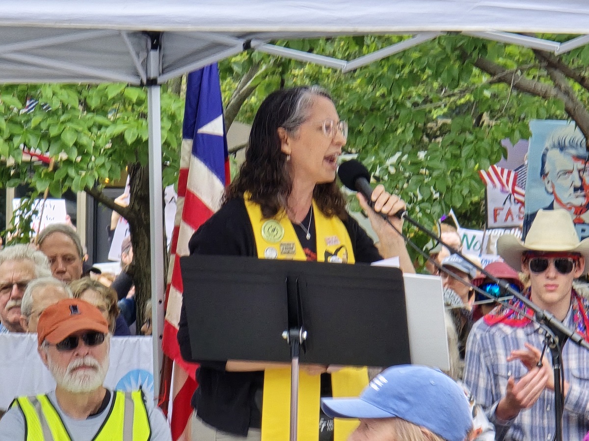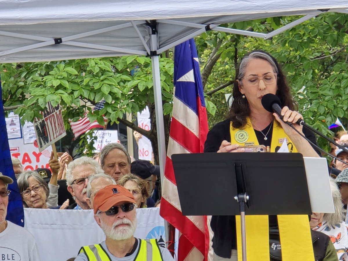 Rev, Eileen Wiviott from Unitarian Church speaking in Fountain Square