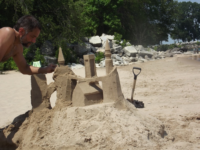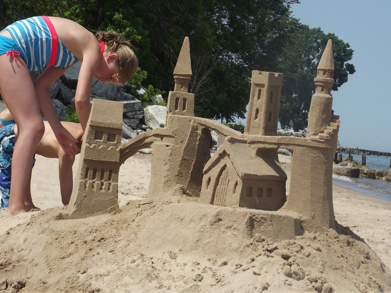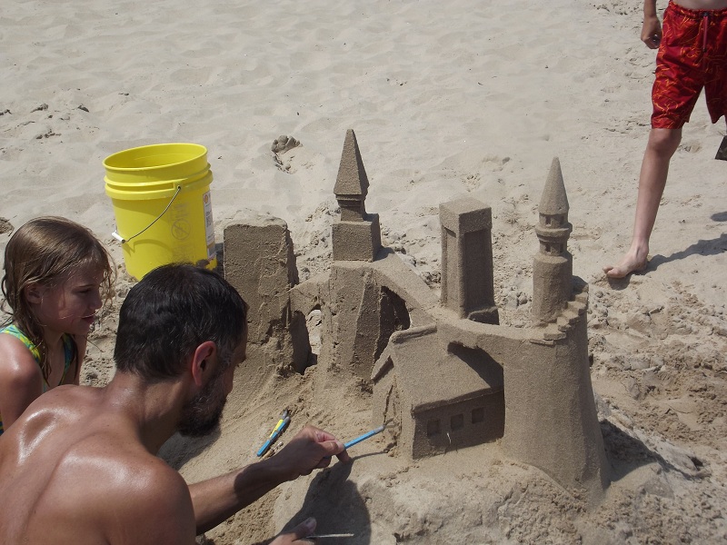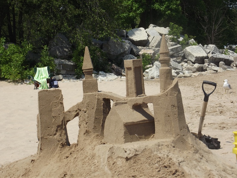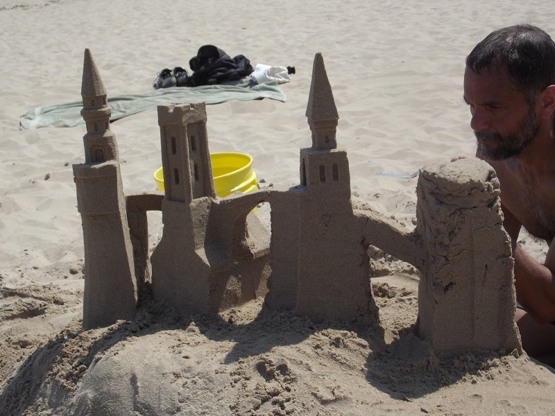 Starting -- first two towers, bridge, house, and big damp mass of sand