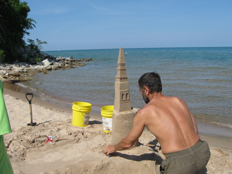 Filling round container with sand and water and jumping on it to make firm foundation for second tall tower
