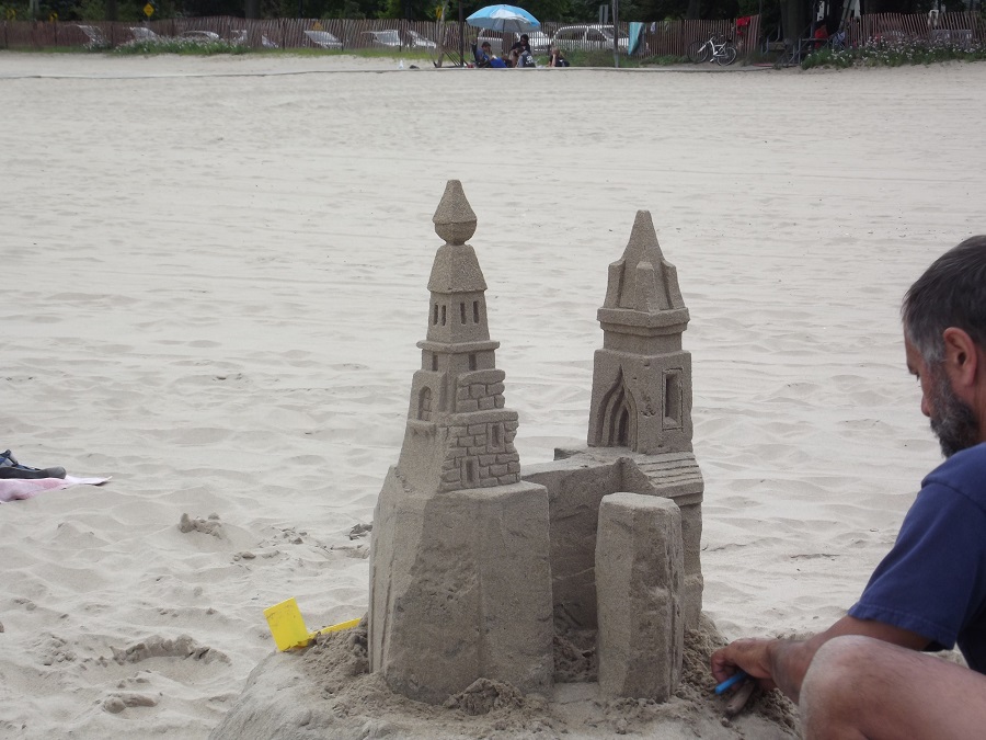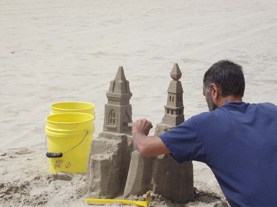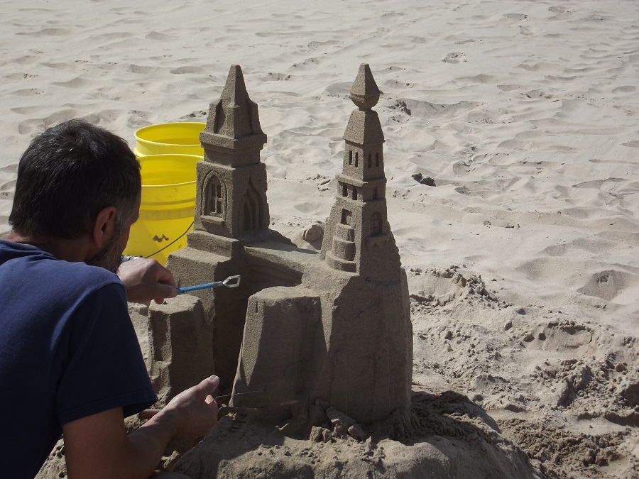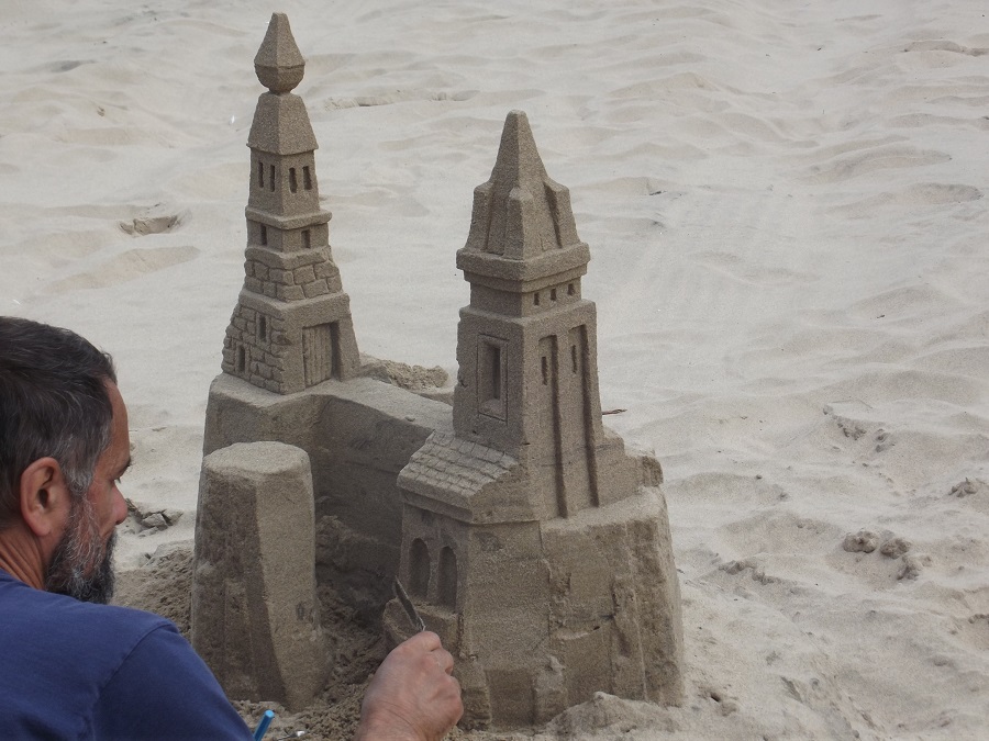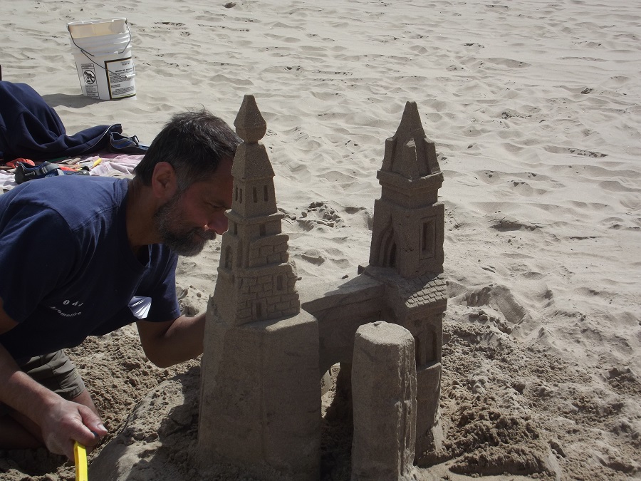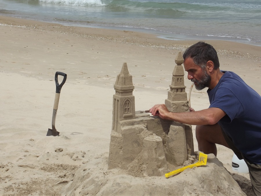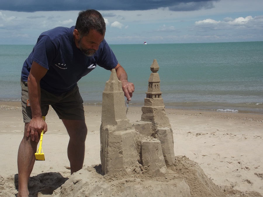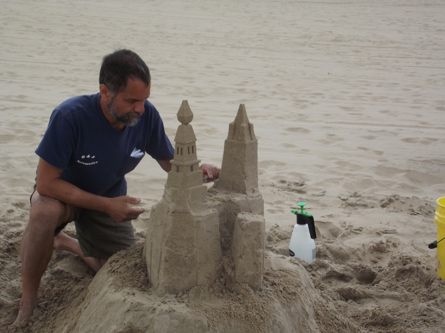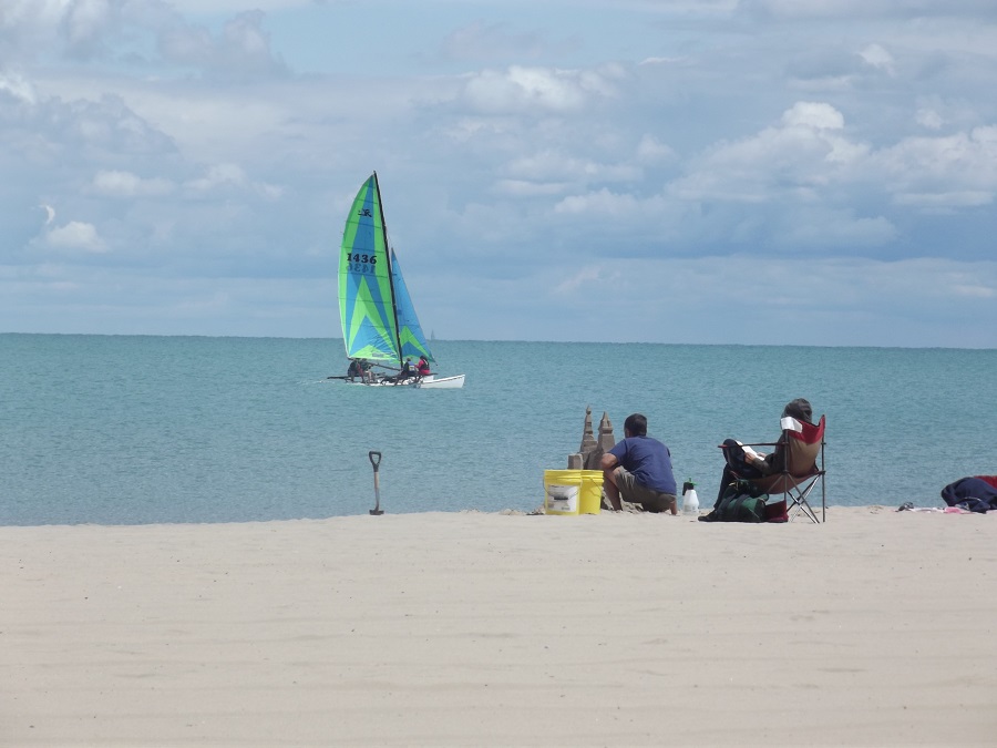 Omar at work on castle with his wife while large hobiecat with blue-green sails comes past quite close