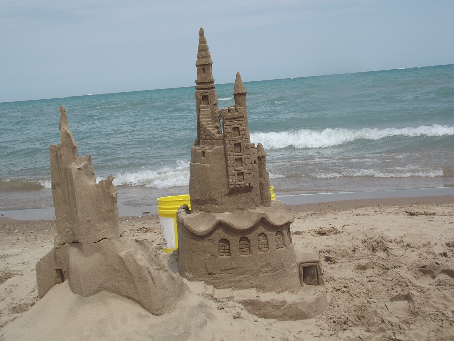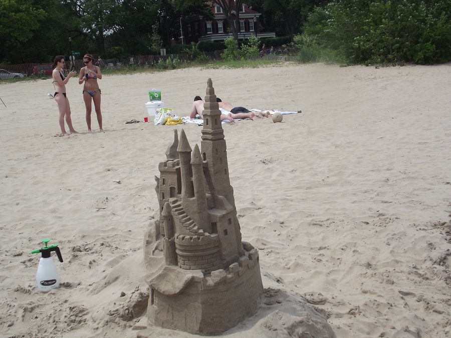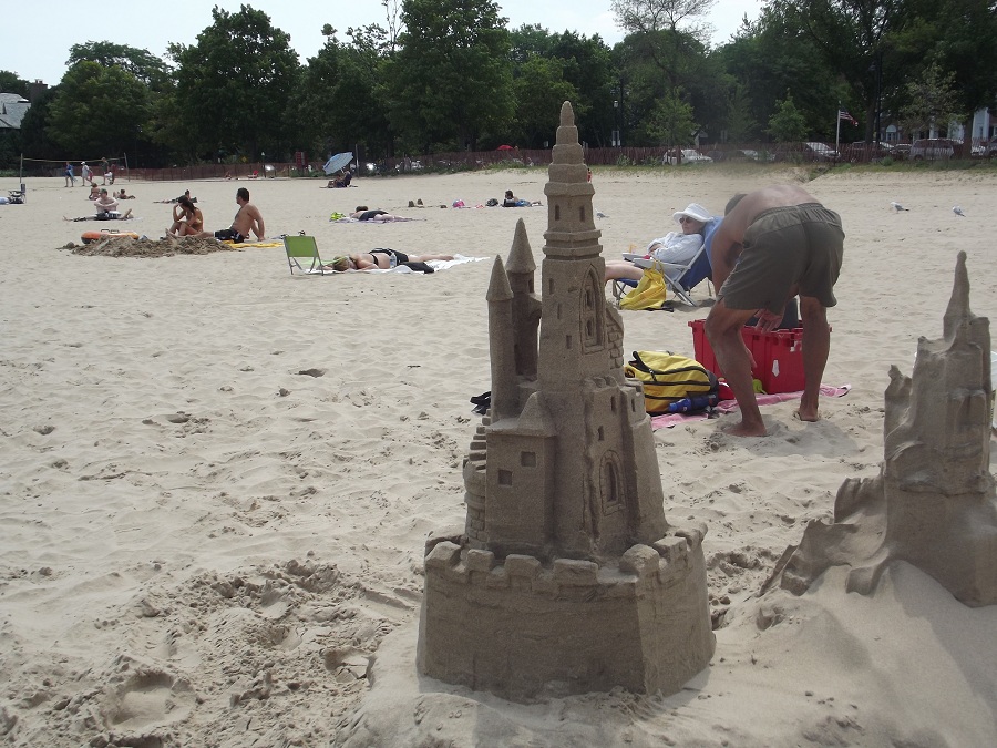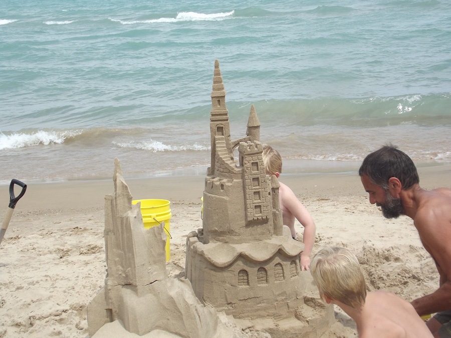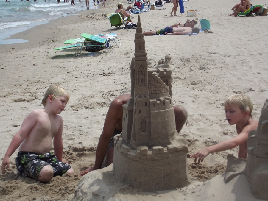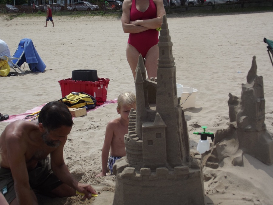 Most of castle completed (with ruins of Saturday's at left) while Omar works on steps to low door -- with two enthusiatic young observers