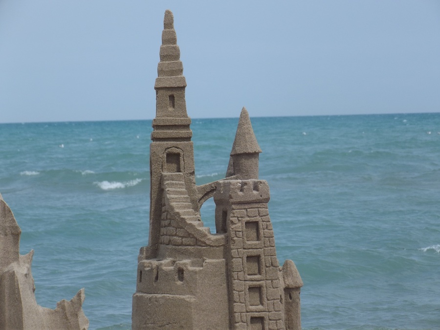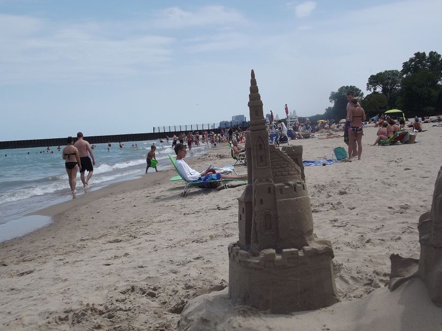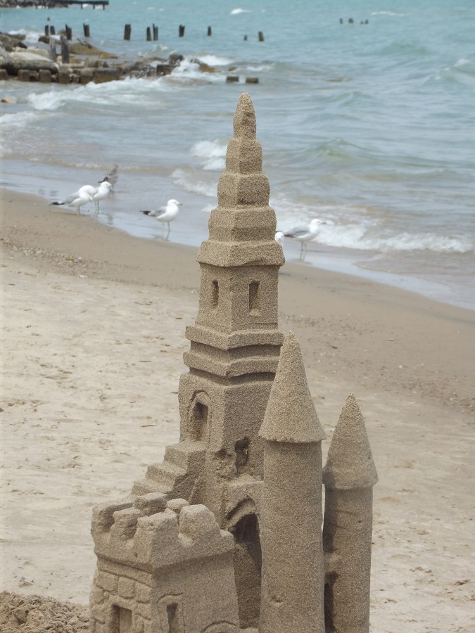 Castle from north showing windows, stonework, stairs and battlements with the rest of beach, Willis and Lake Point Towers