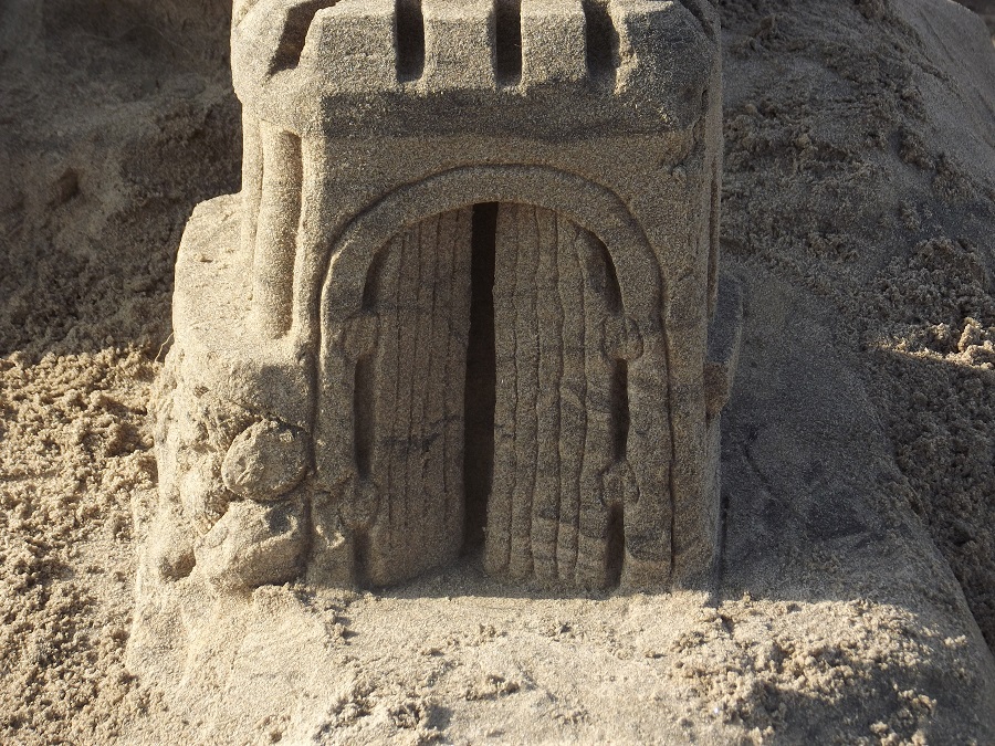 Castle from south showing two huge hinged doors partly open in arched entrance at bottom of south tower