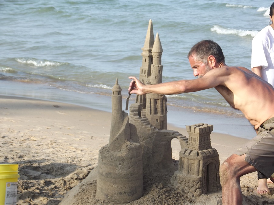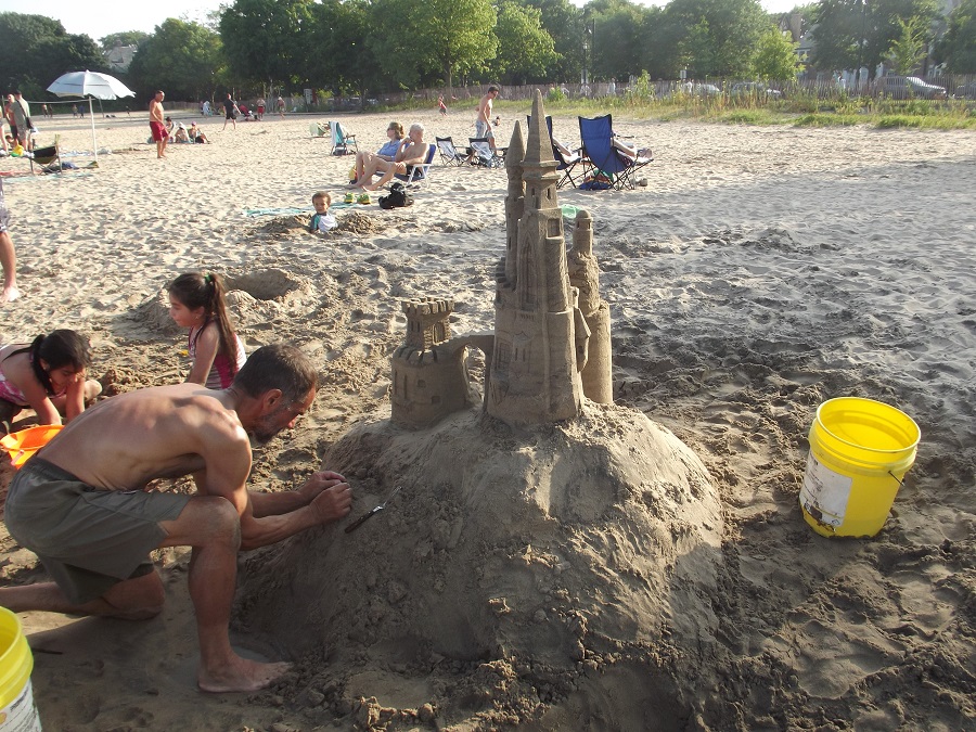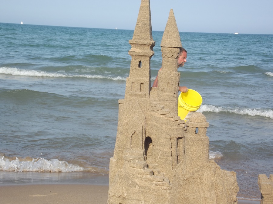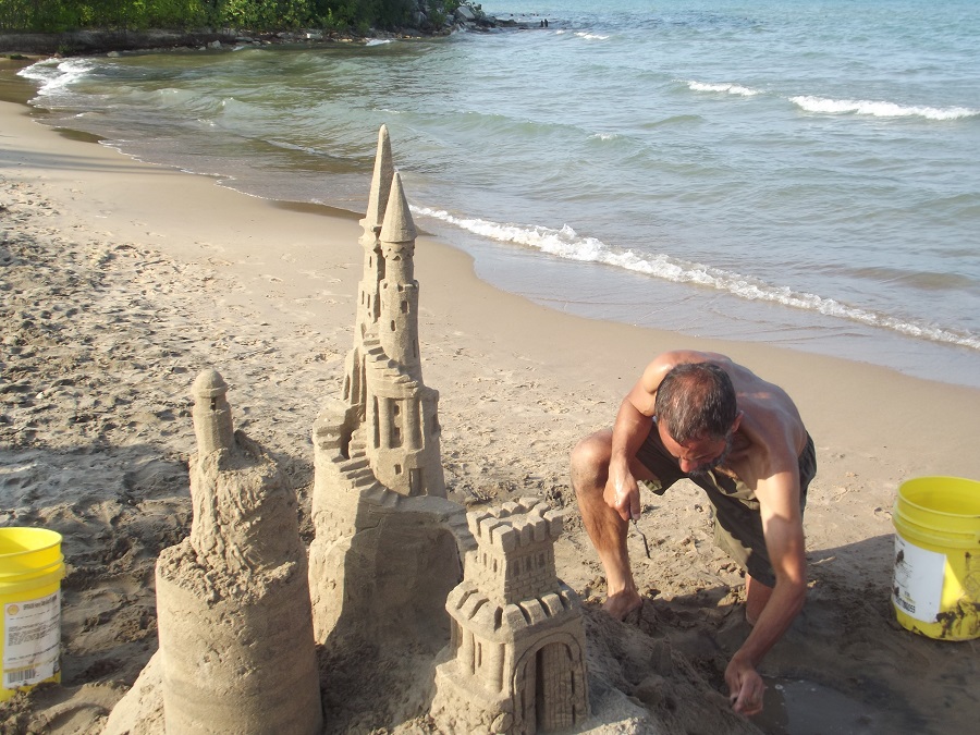 Castle from northwest showing artwork and new small cupola with windows, a cone roof and fringed eves