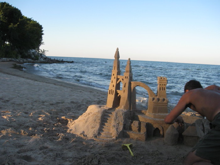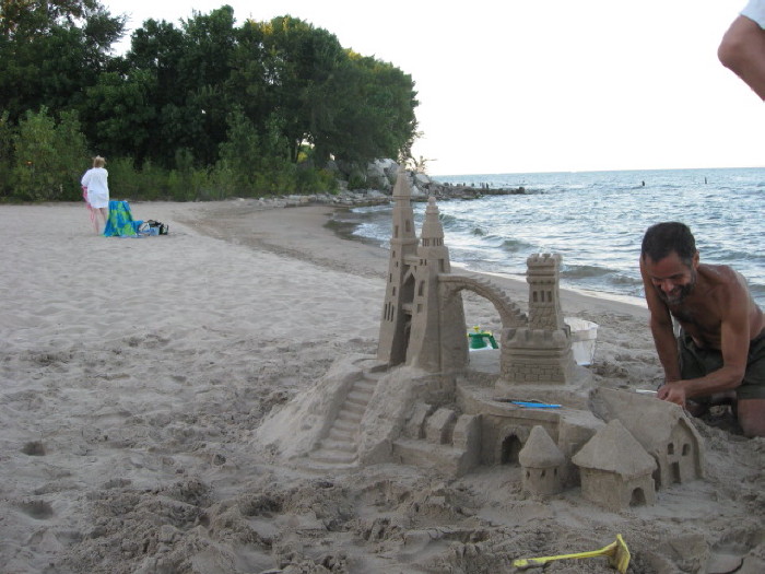This artist, Omar, is excellent at sculpting very intricate and impressive sand castles. He's been doing it for over four years. and has sculptted hundreds of castles. He mainly has worked on Saturday and Sunday mostly on Lee Street Beach in Evanston. He has found a spot on Lee St. Beach where the sun remains the longest before setting, and makes his artistic creations there.