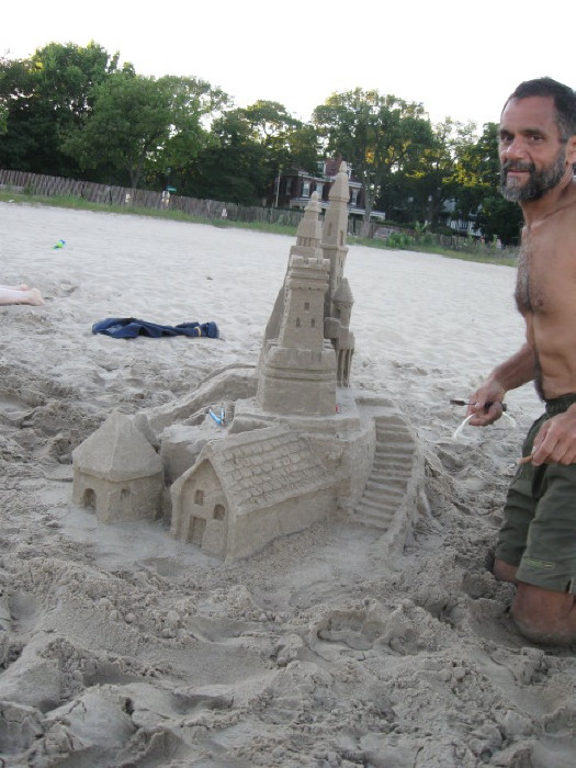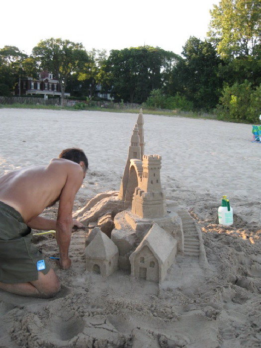 By profession he is an auto mechanic, so he is skiled in precise, exact work. He told me he is still a child at heart and loves to come to the beach and make castles. After his children grew up, he started this hobby of exact sand castle sculpting to he can still come to the beach every weekend and make sand castles.