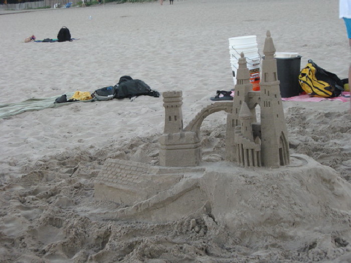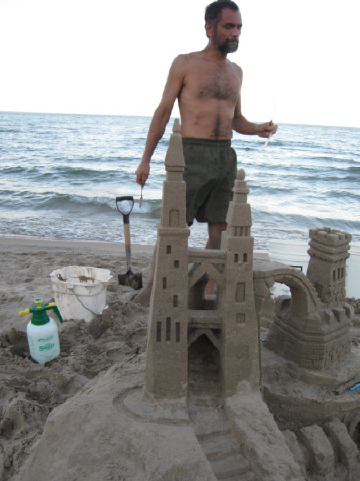 He can construct castles in may styles, including Chinese pagodas, but none of them are intended to resemble an actual physical castle. He uses up to ten different sculpting tools, but most often and common are a simple metal chistle about a half an inch accross, the spray bottle to keep his finished work from drying and blowing away, and the clear plastic tube with which he blows all loose recently sculpted sand away.