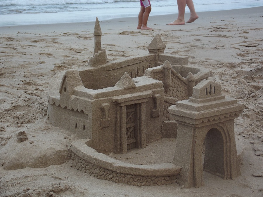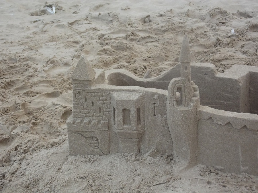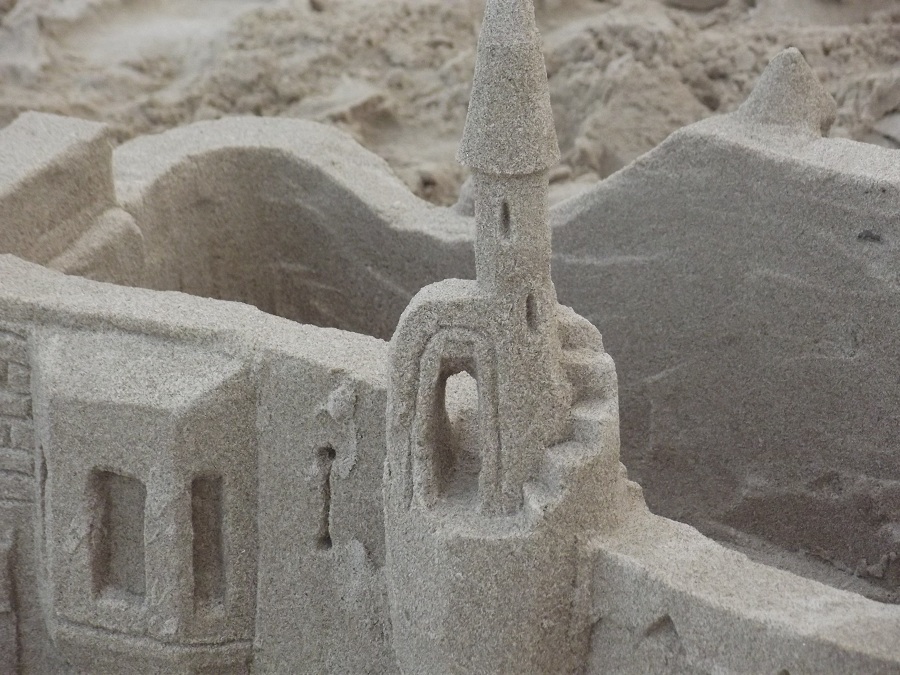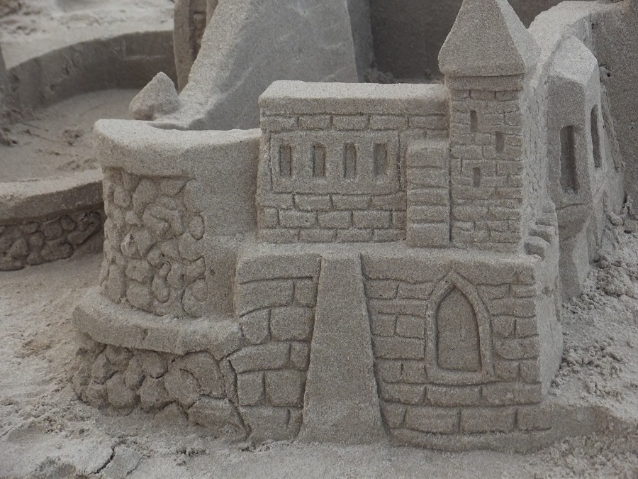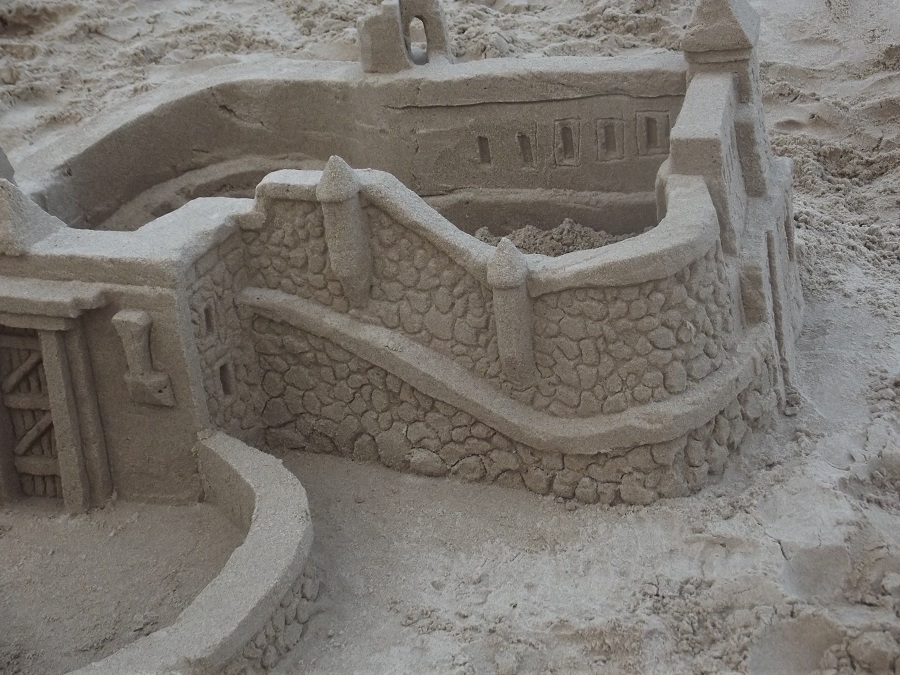 Thin tall tower with spiral stairs, windows, stonework, battlements, and corner tower on east side