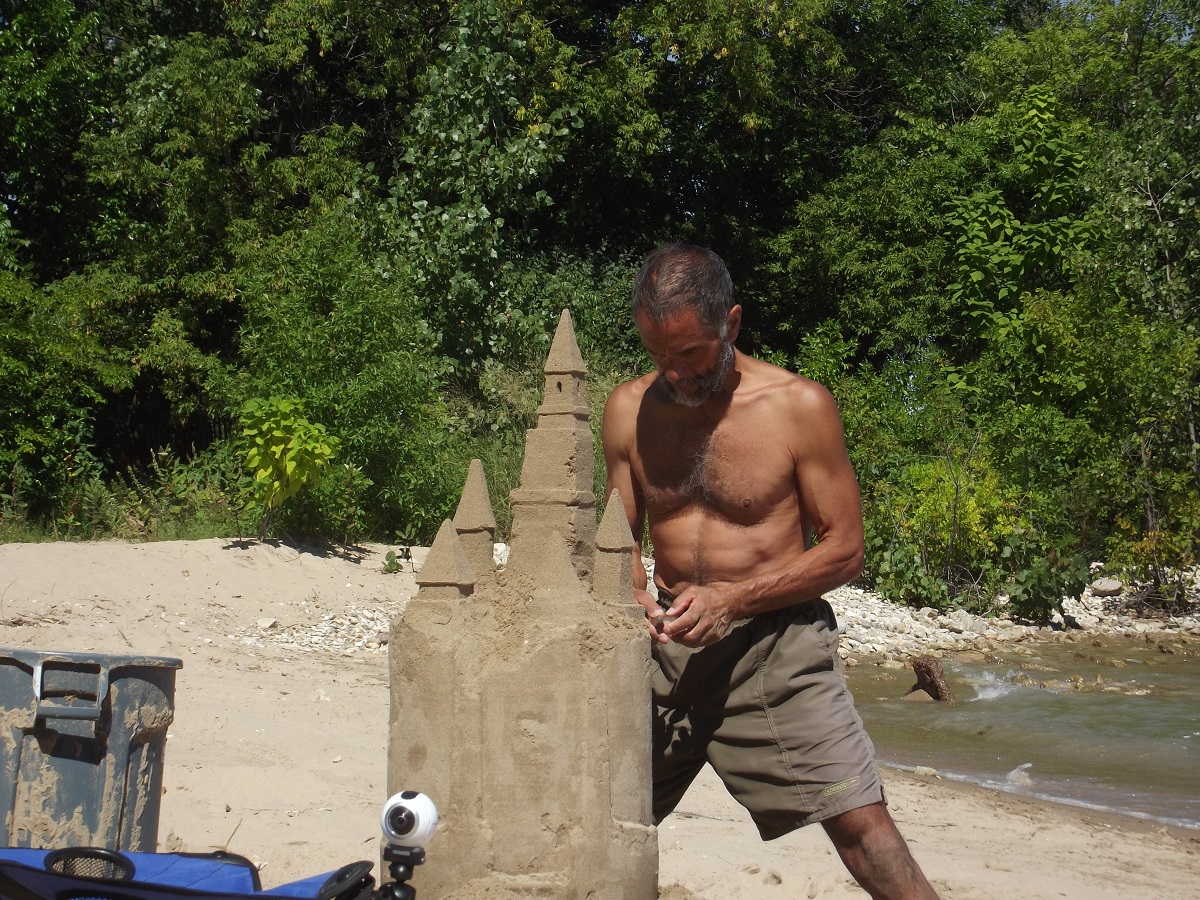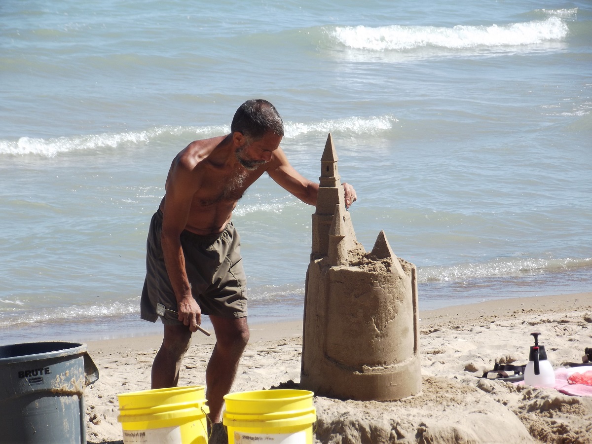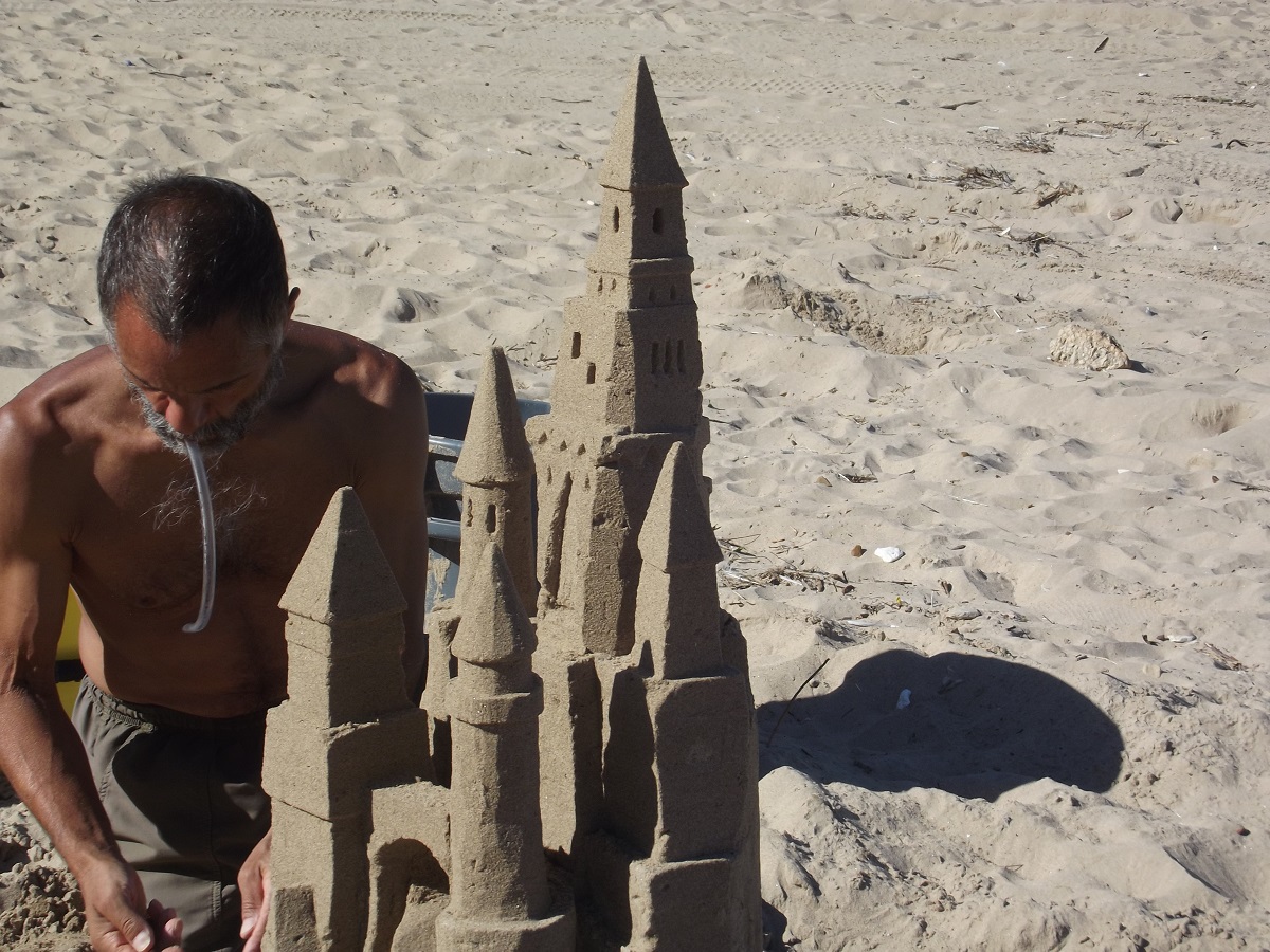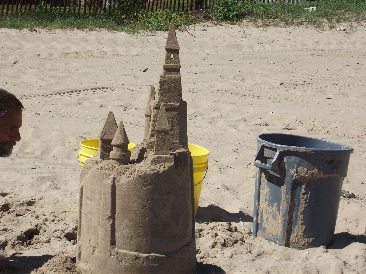 First telephoto of Omar with completed top tower, beginnings of three towers below it, and mostly compact sand mold from grey trash can at far left, from which he will carve castle