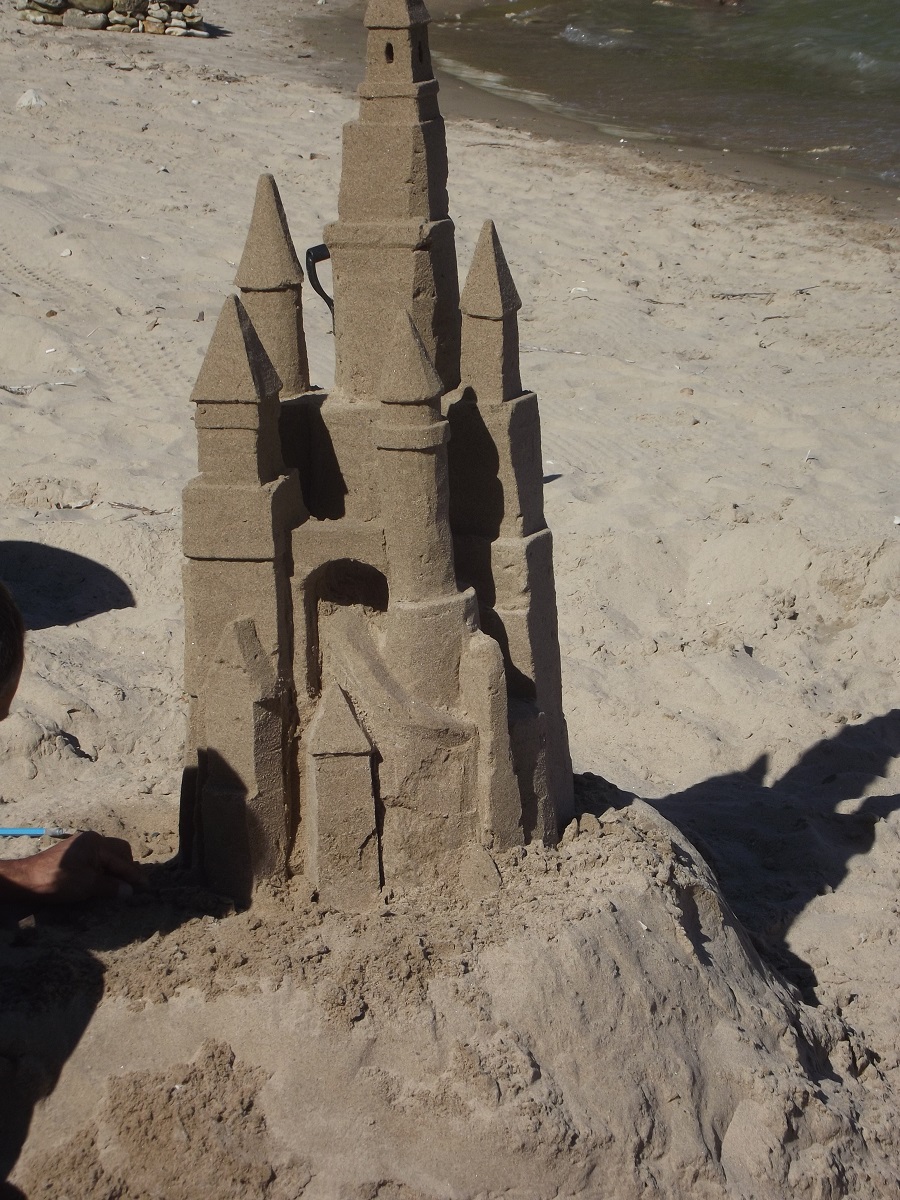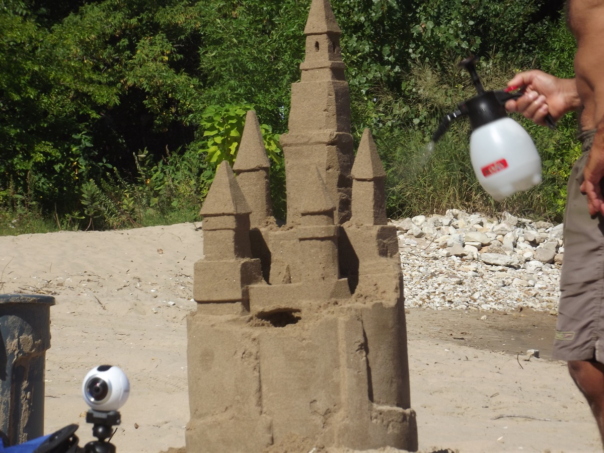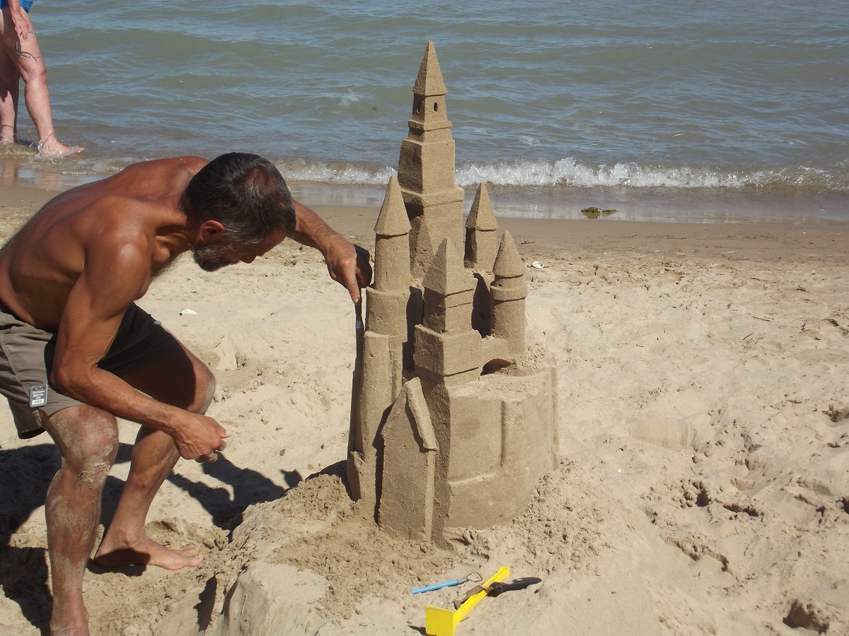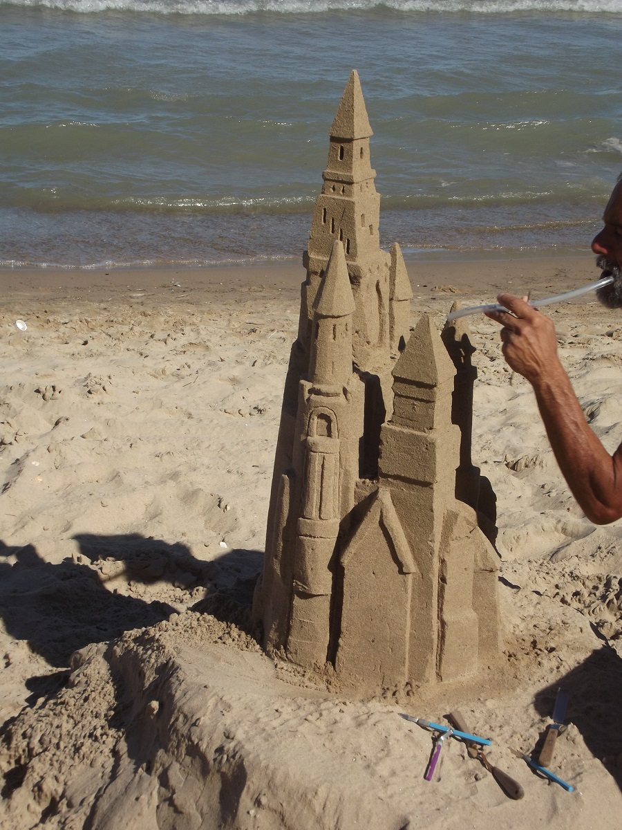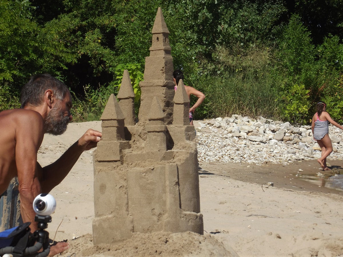 First telephoto of Omar with completed top tower, beginnings of three towers below it, and mostly compact sand mold from grey trash can at far left, from which he will carve castle