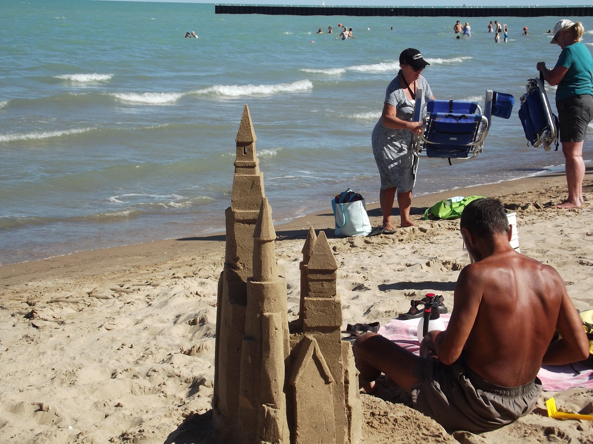 Swimmers, ladies with chairs, Omar, and castle from west side