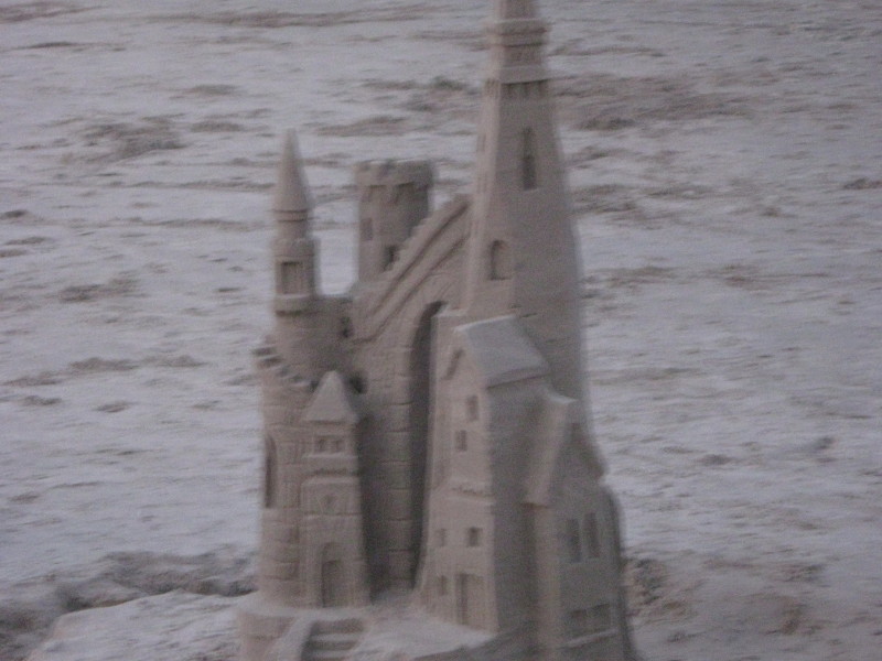 He can construct castles in may styles, including Chinese pagodas, but none of them are intended to resemble an actual physical castle. He uses up to ten different sculpting tools, but most often and common are a simple metal chistle about a half an inch accross, the spray bottle to keep his finished work from drying and blowing away, and the clear plastic tube with which he blows all loose recently sculpted sand away.