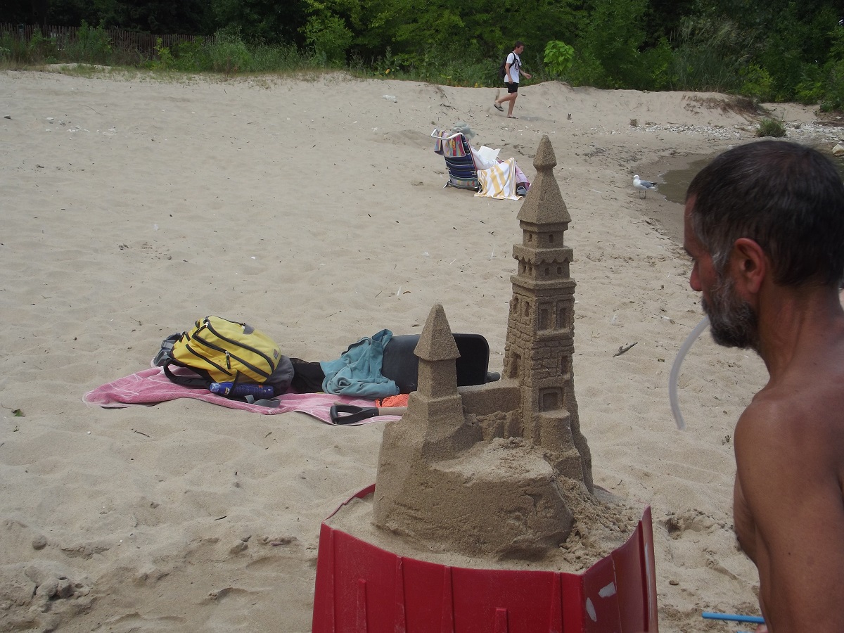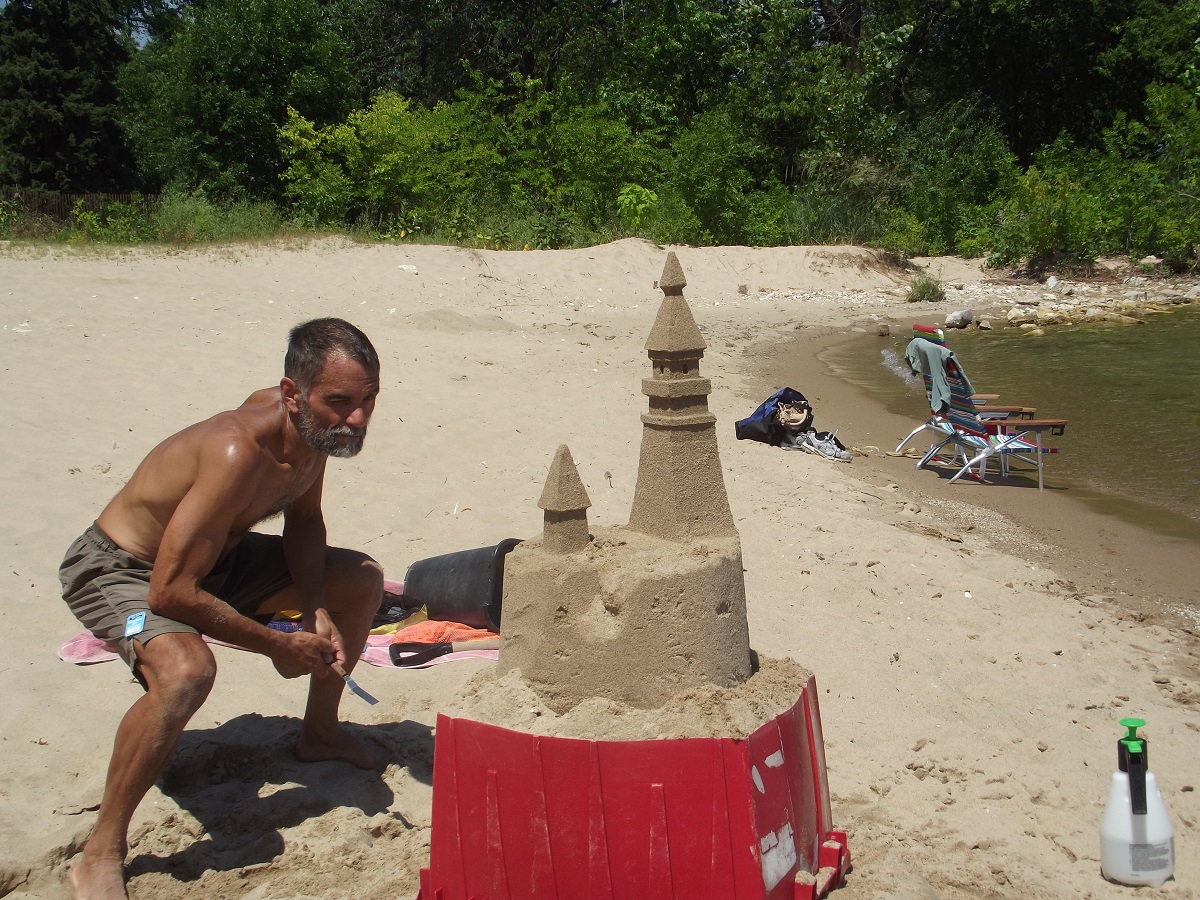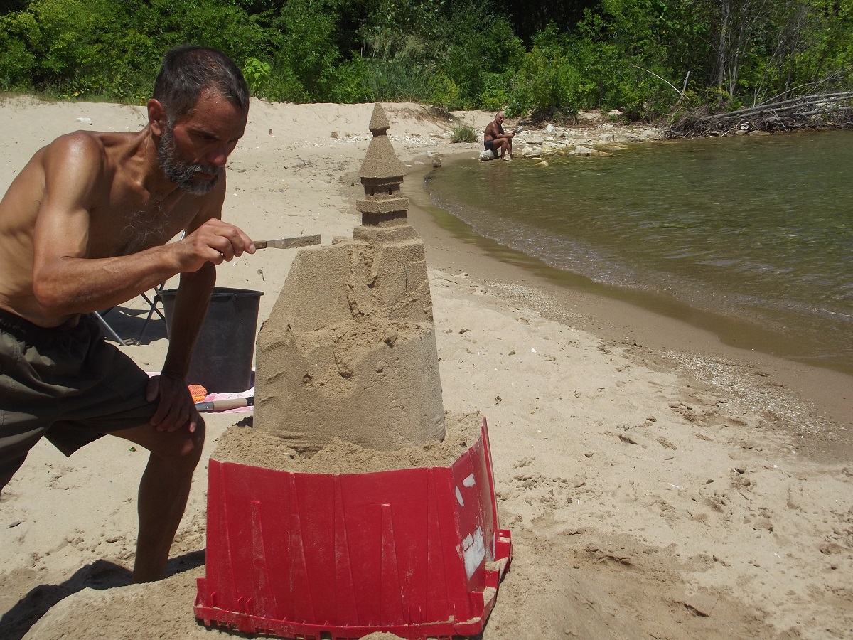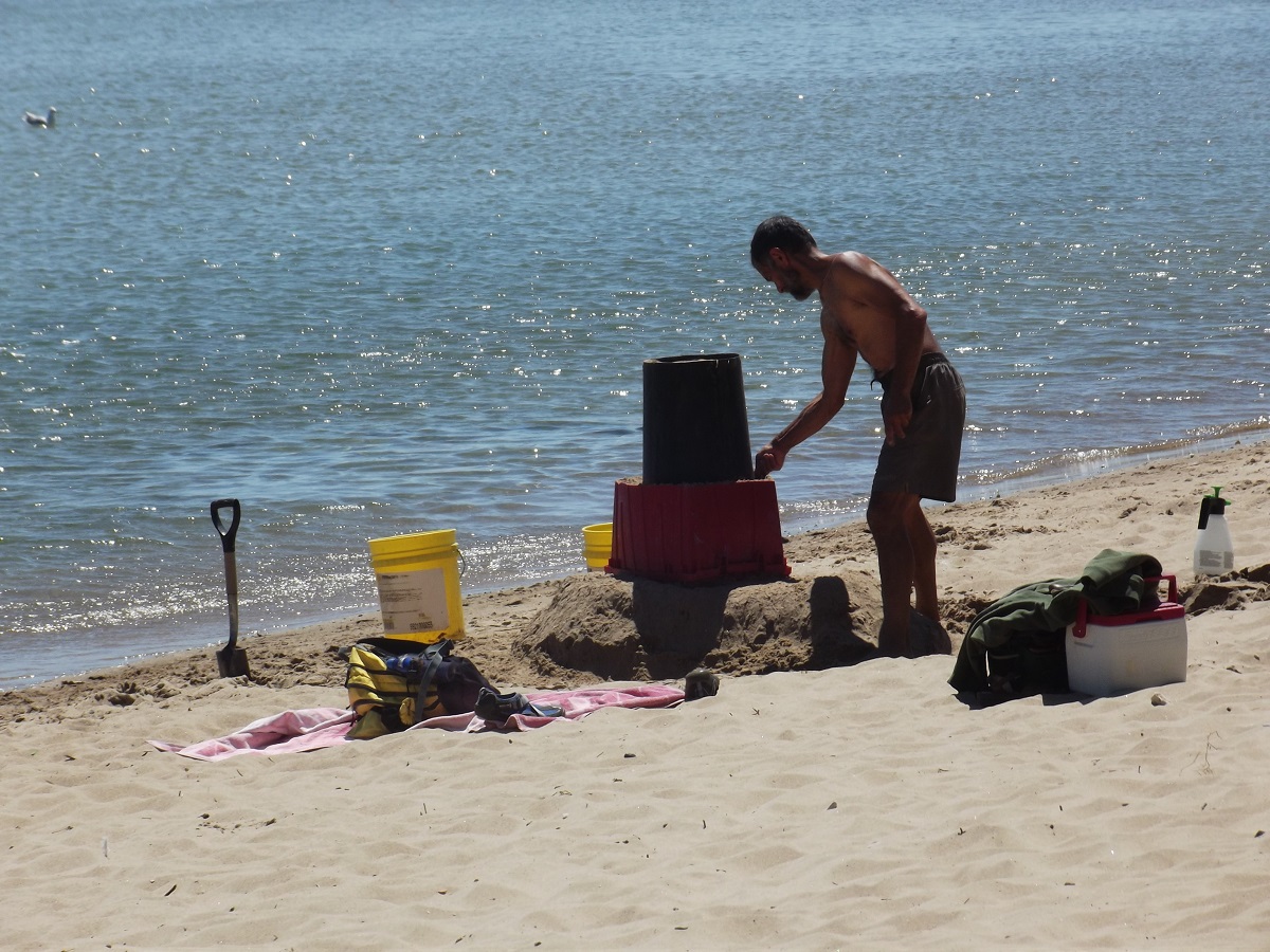 Omar starting his sand castle with a large base of sand then two containers for carving, a large red one and a smaller in diameter but taller black one