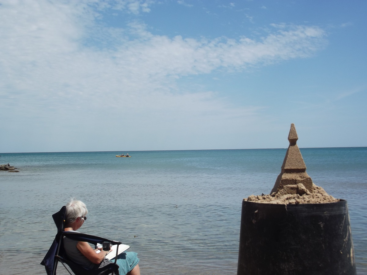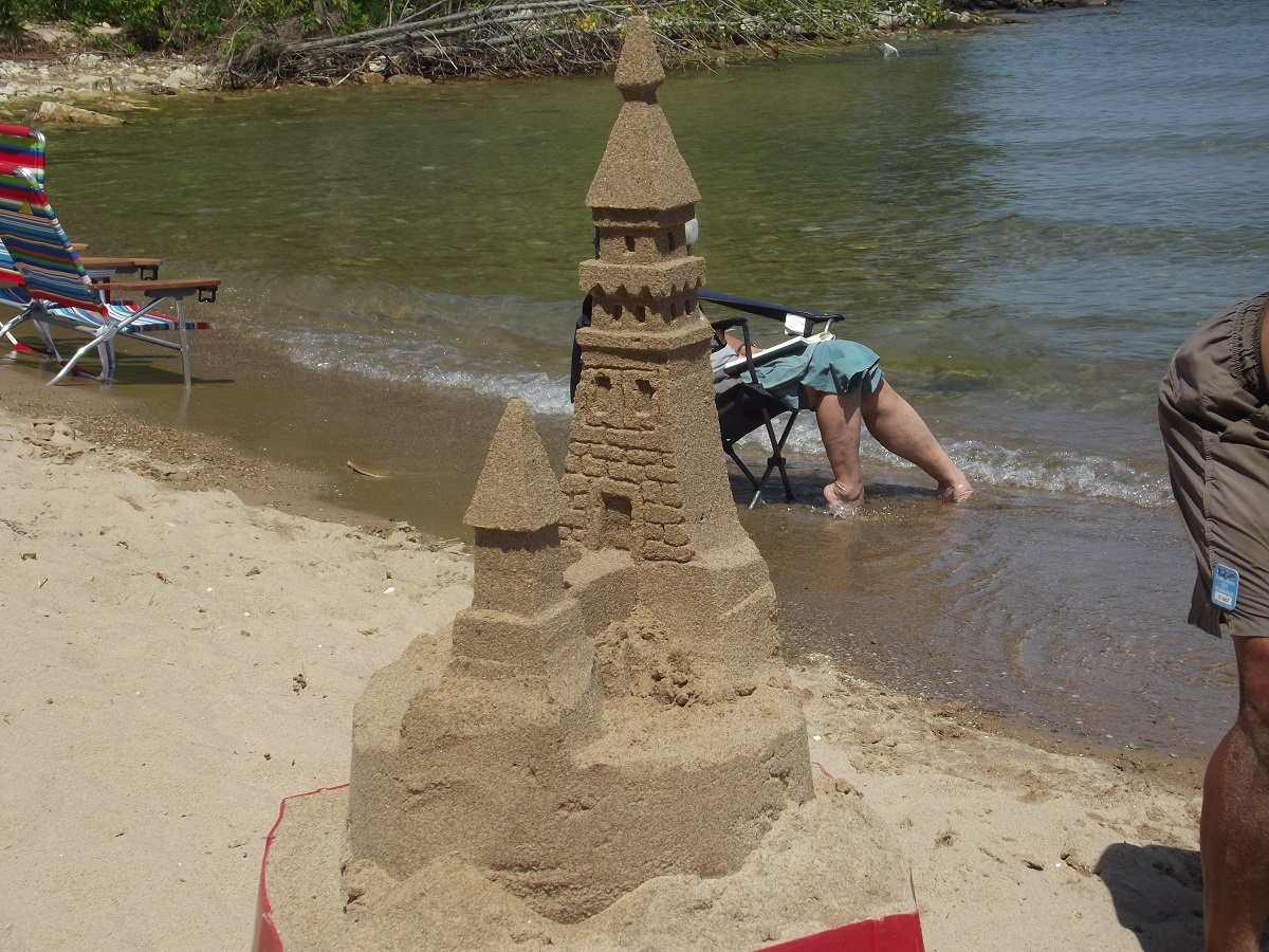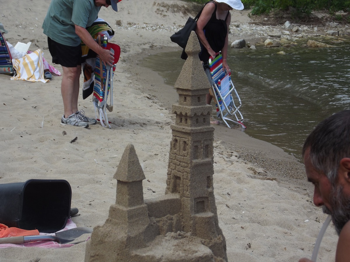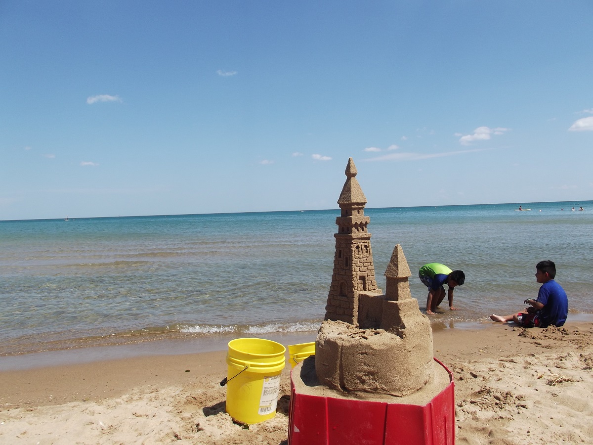 Omar starting his sand castle with a large base of sand then two containers for carving, a large red one and a smaller in diameter but taller black one