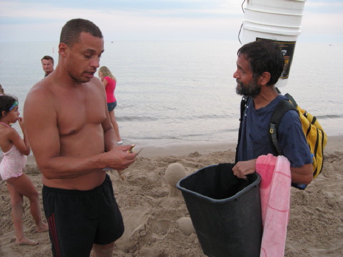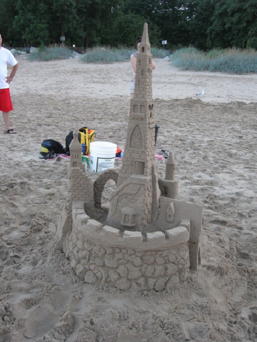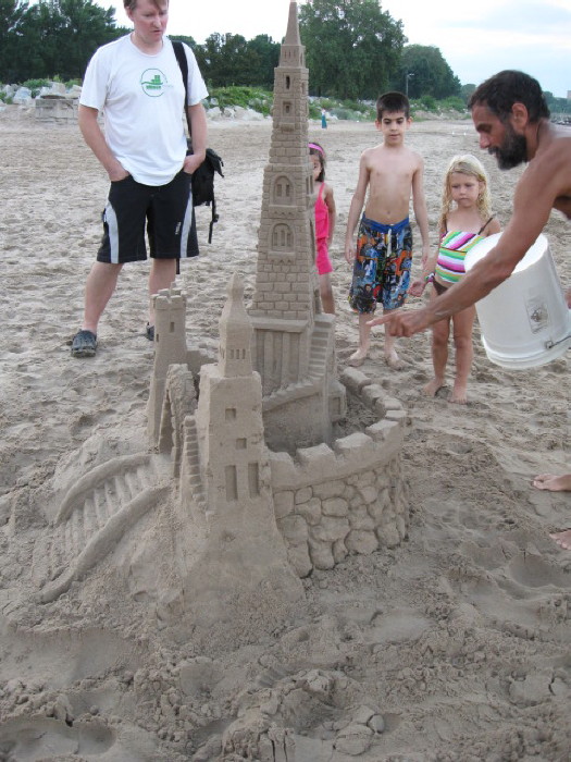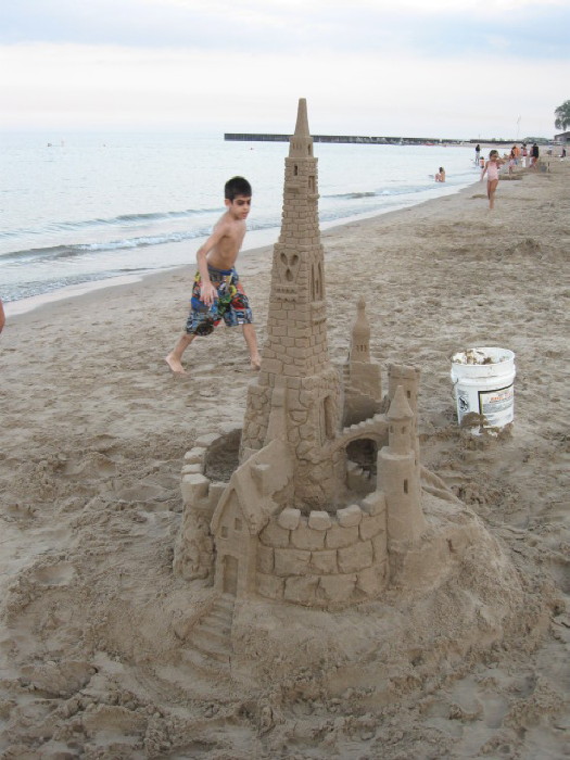 This artist, Omar, is excellent at sculpting very intricate and impressive sand castles. He's been doing it for over four years. and has sculptted hundreds of castles. He mainly has worked on Saturday and Sunday on Lee Street Beach in Evanston. He has found a spot on Lee St. Beach where the sun remains the longest before setting, and makes his artistic creations there. Today is the first time he has worked on Greenwood St. Beach, just north of Dempster.