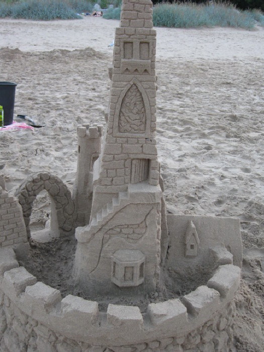 He can construct castles in may styles, including Chinese pagodas, but none of them are intended to resemble an actual physical castle. He uses up to ten different sculpting tools, but most often and common are a simple metal chistle about a half an inch accross, the spray bottle to keep his finished work from drying and blowing away, and the clear plastic tube with which he blows all loose recently sculpted sand away.