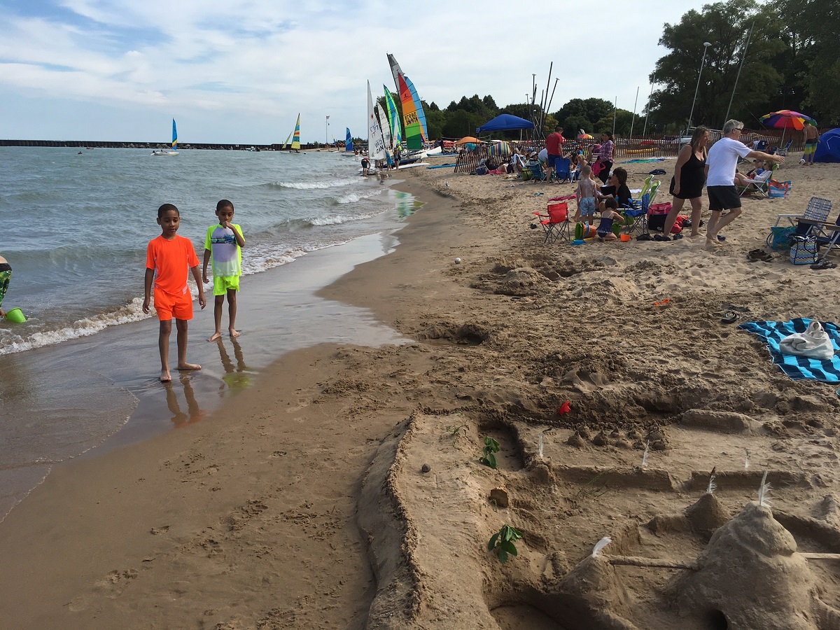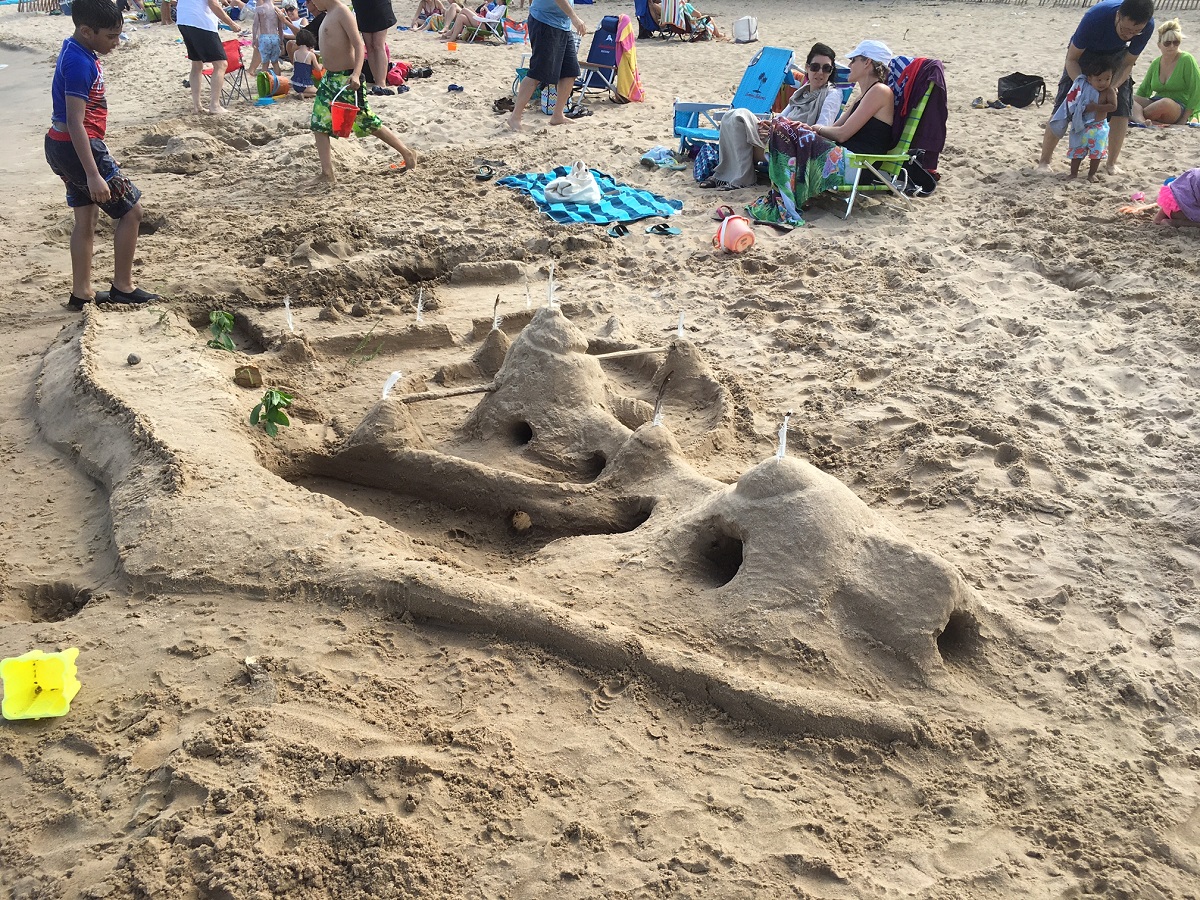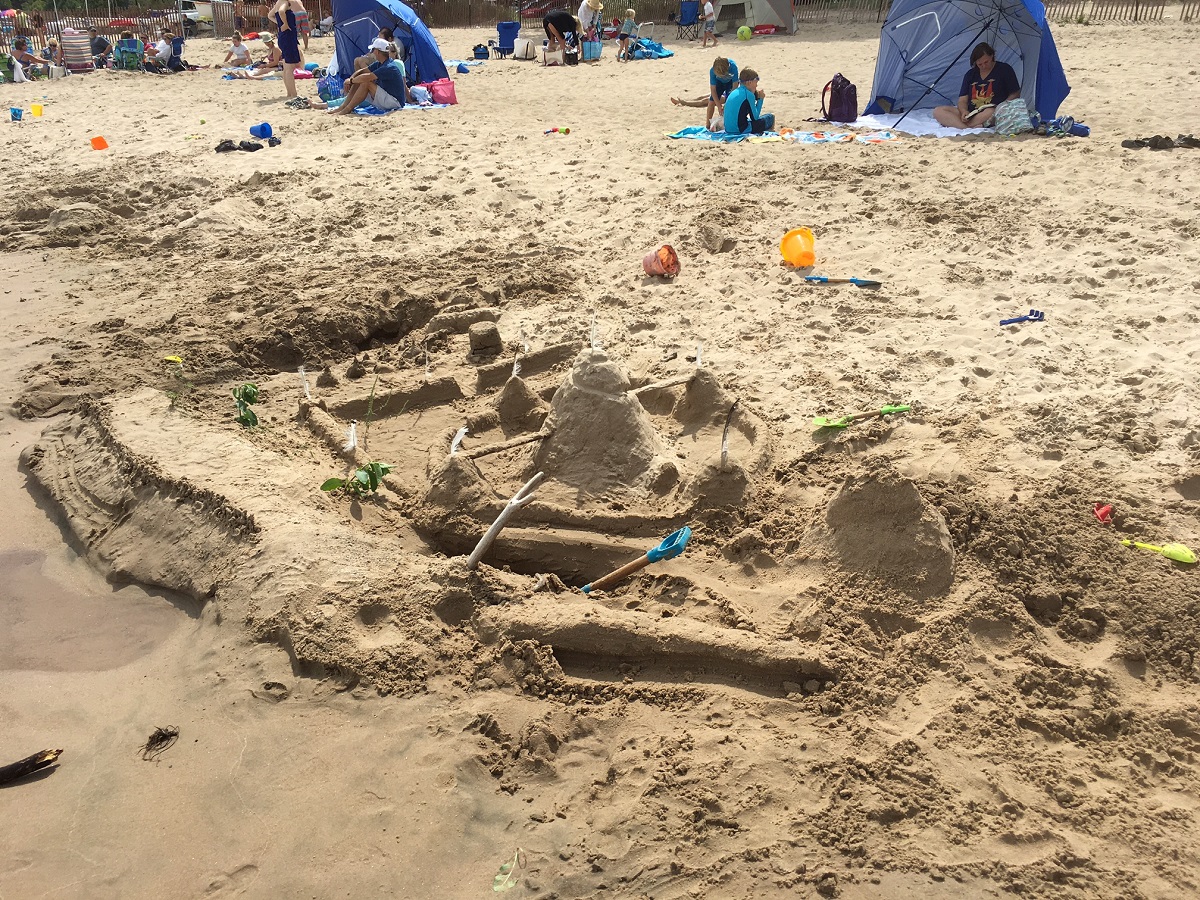 Another view of castle by boys also showing many sailboats at Dempster beach