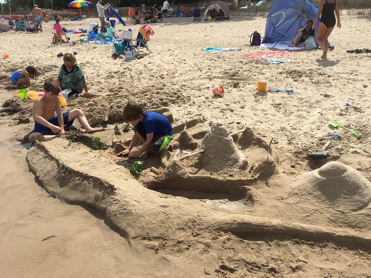 Two boys making large castle at Greenwood Beach