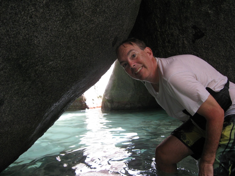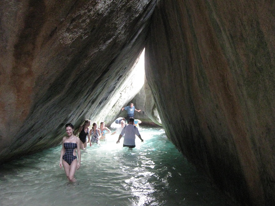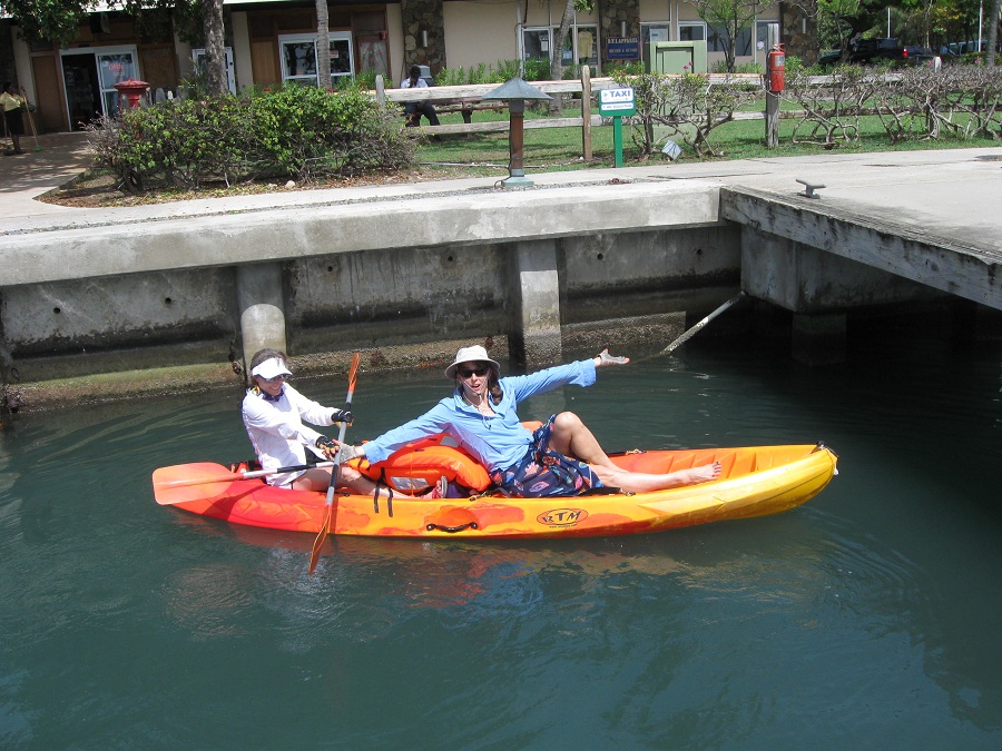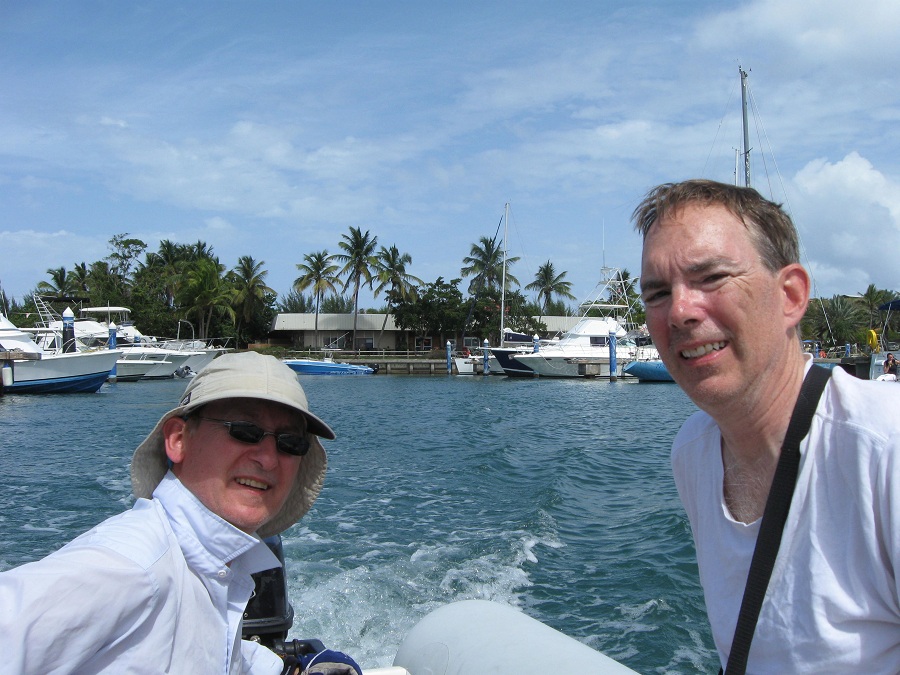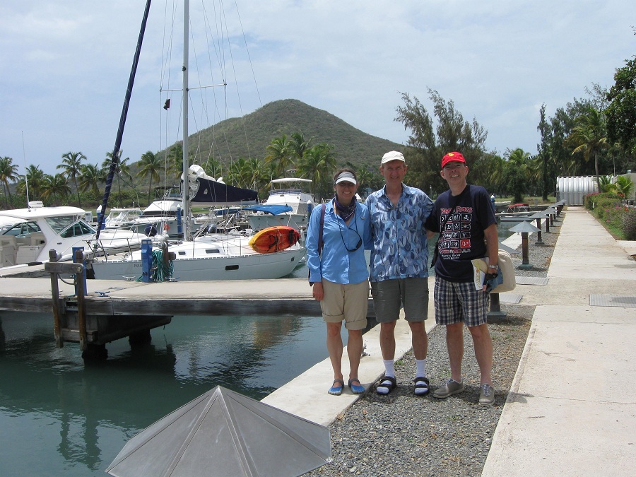 Dorothy, Bill, Andy, our ship with orange kayak in background -- after we are safely tied to a slip on Virgin Gorda in Spanish Town