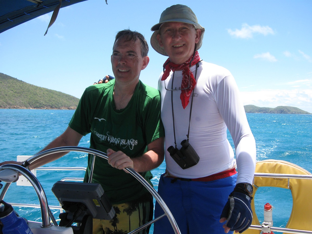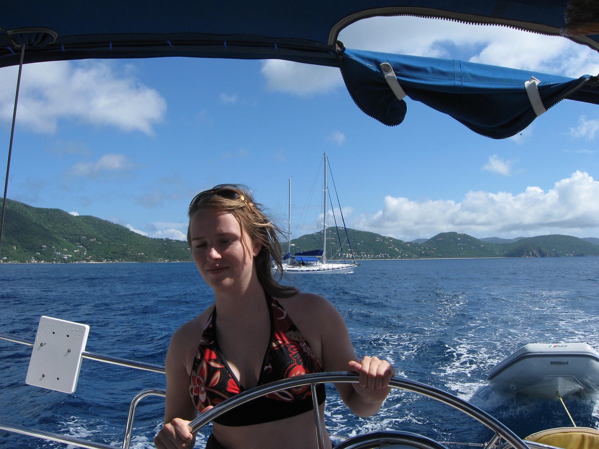 Next morning, Carol and Andy steering for our first fruitless attempt to moor at Sandy Cay, so we returned to Cane Garden Bay