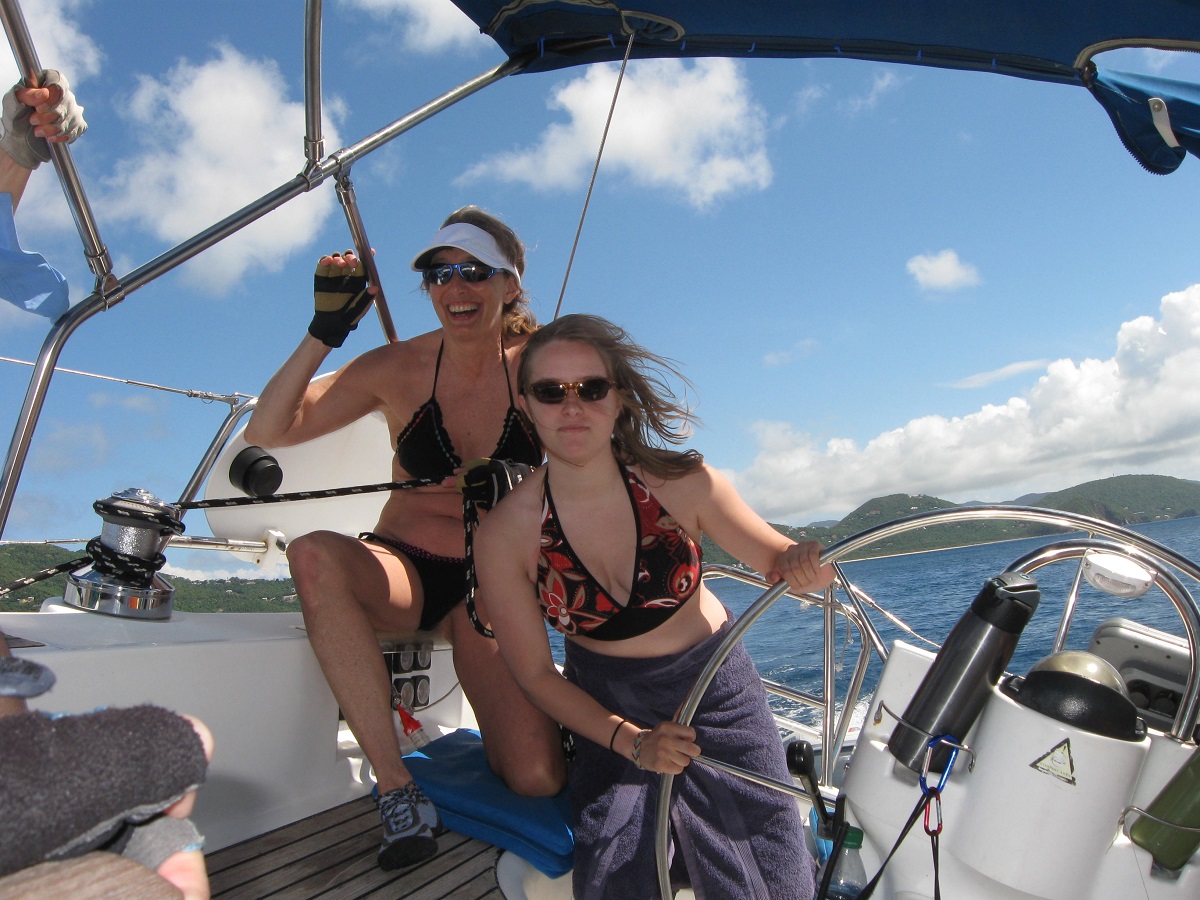 Carol with Natalie steering -- the boat is at quite a heel with all the sails up