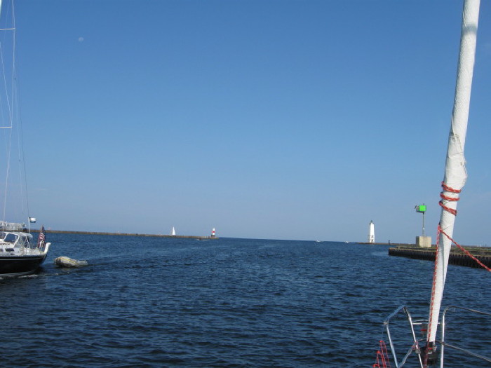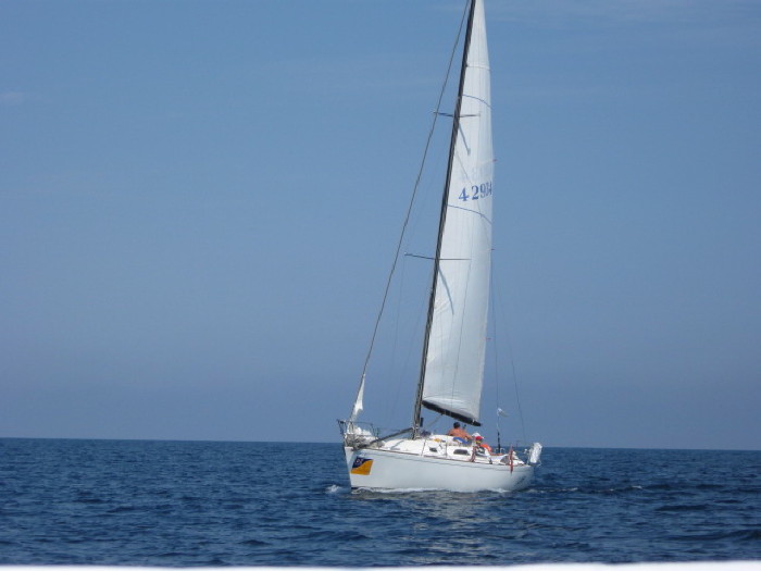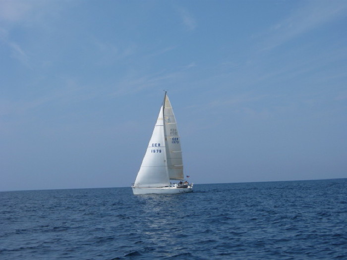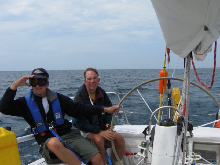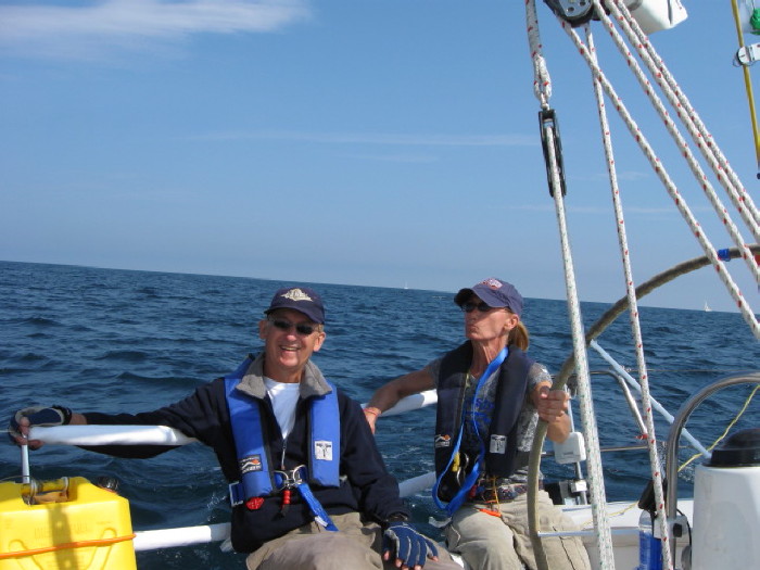 Bill and Betsy while truly sailing just outside Frankfort. For the whole trip, this was the ONLY chance we had to truly sail and go seven knots without using the engine at all!!