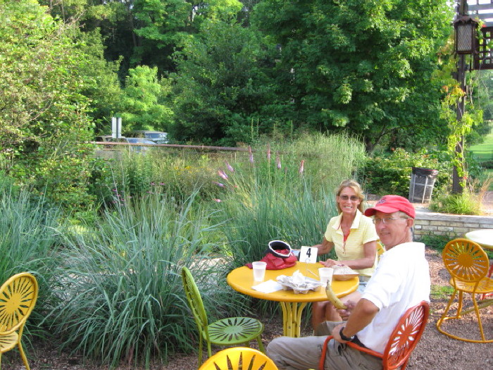 Betsy, Bill eating with flowers -- Monday, 8/2/10