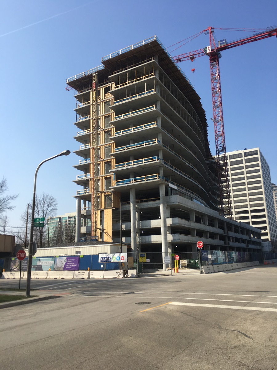 All forms for floor 11 completed, concrete for south end of 11 poured, starting forms for south end of floor 12, showing high crane with a load and Willis Tower no longer visable -- March 22, 2019