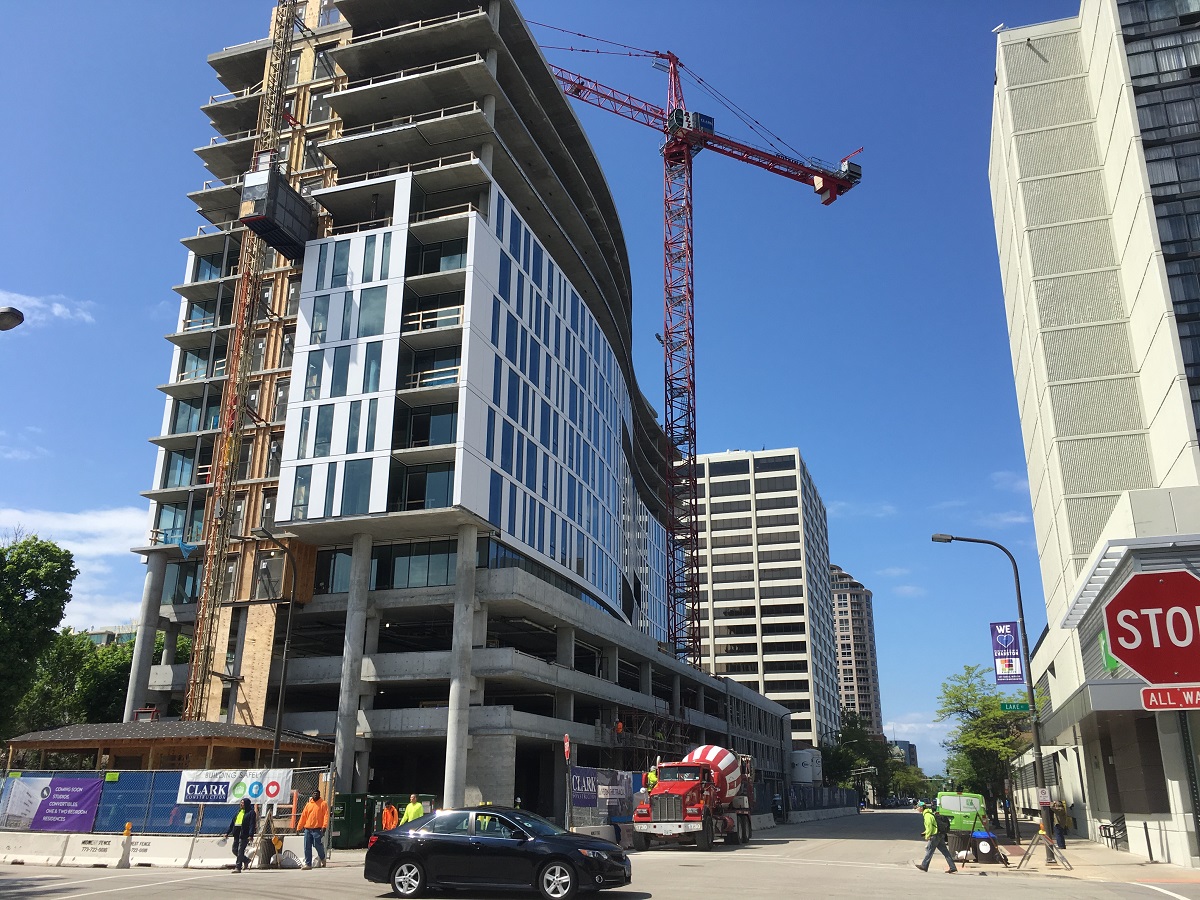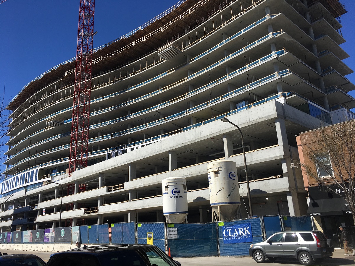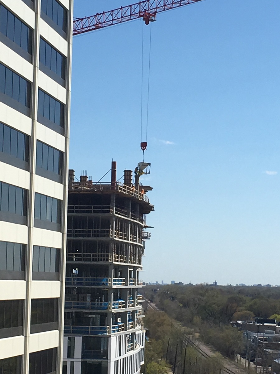 Reaching to floor 15 with concrete pouring in column and windows on lower 3 floors -- April 26, 2019