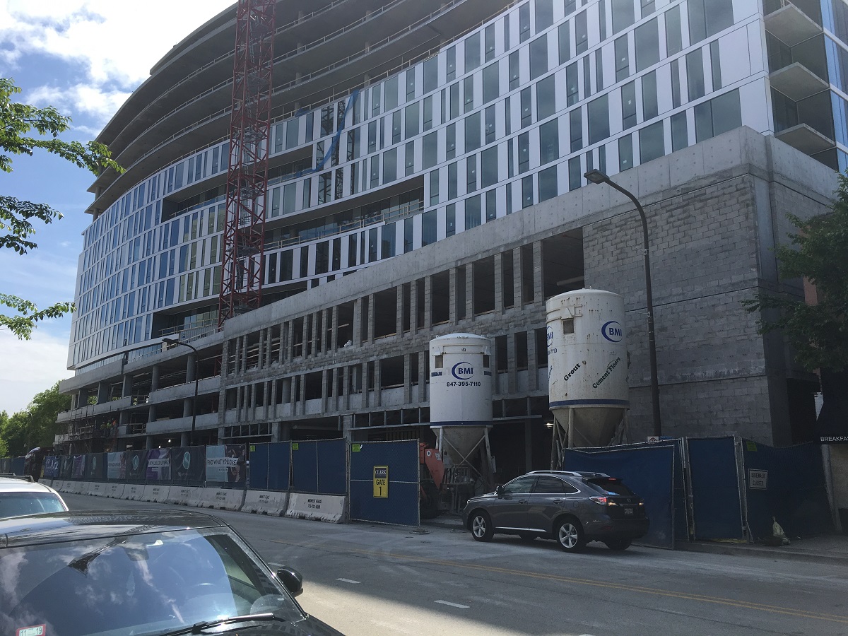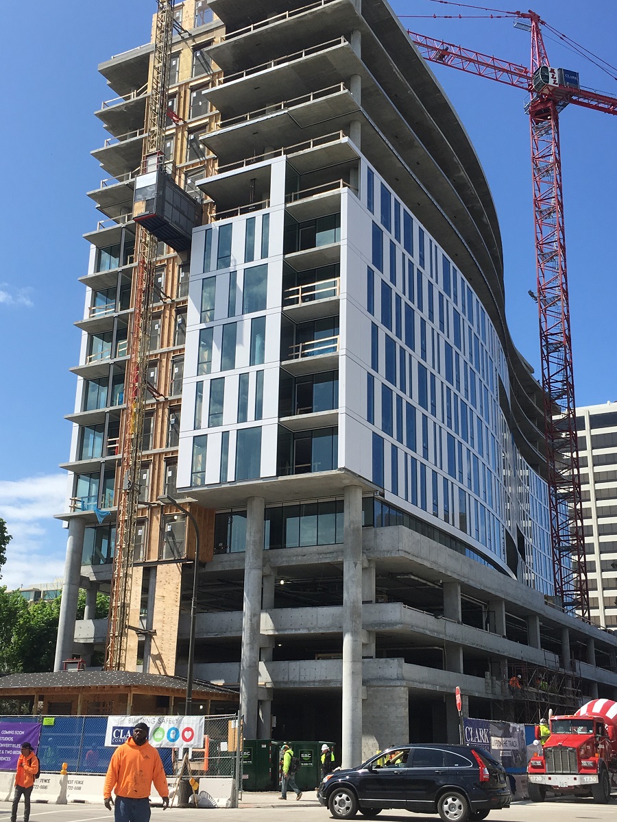 Elevator moter and tank complete on top, outer windows through floor 10, and red concrete pump removed from top of parking floor 4 -- June 4, 2019