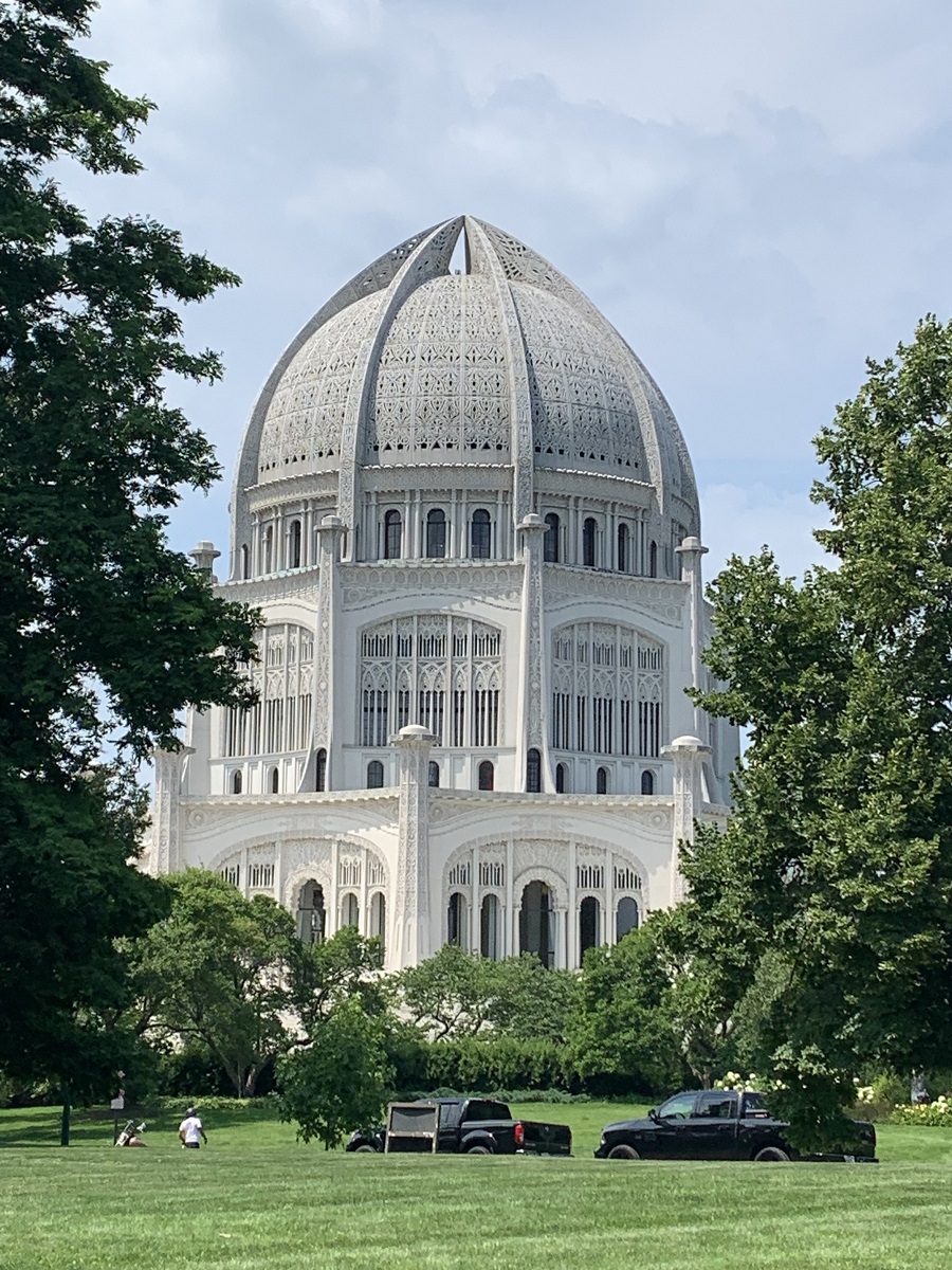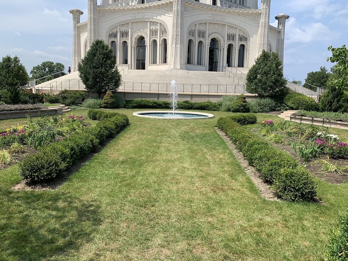 Baha'i welcoming lagoon with waterfall to the southwest from welcoming building