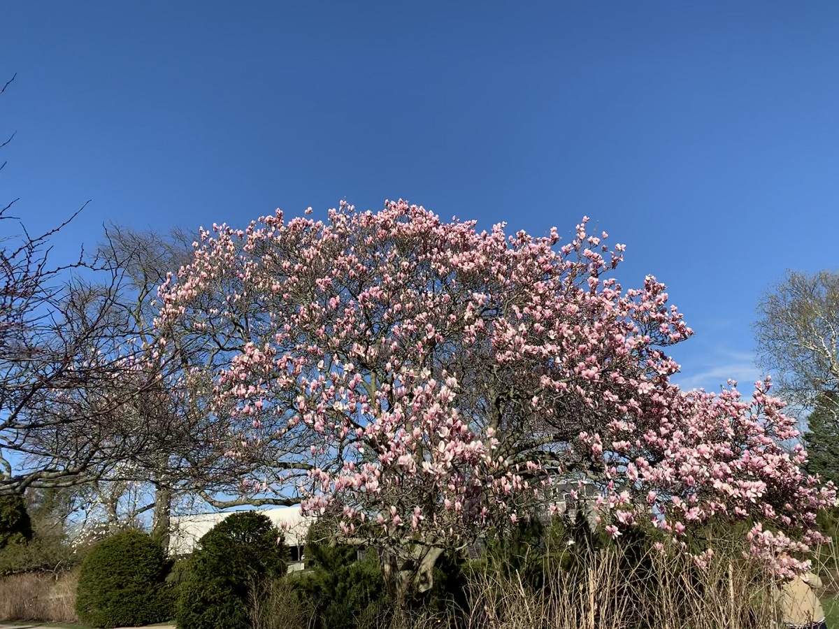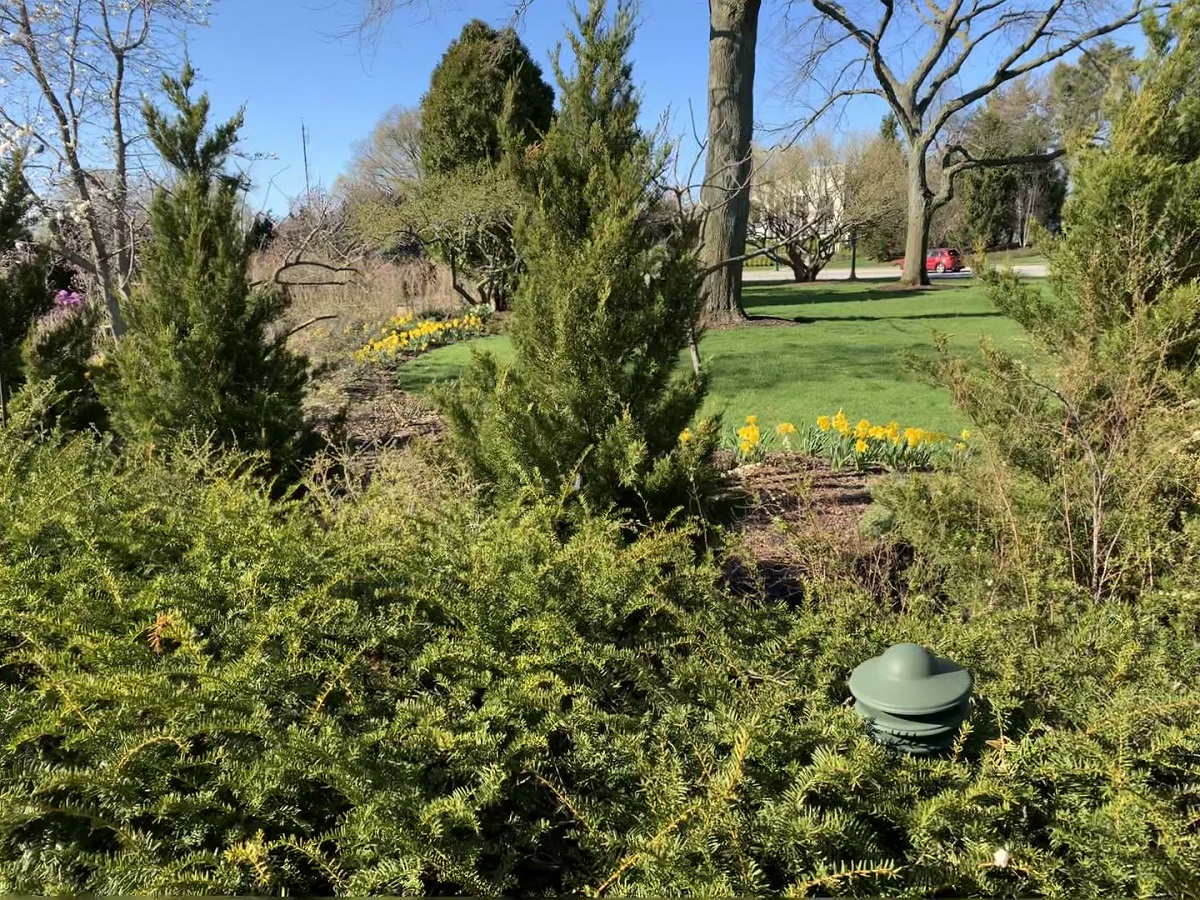 Moving around to the southwest and looking northeast into another garden with a fountain and many white flowers