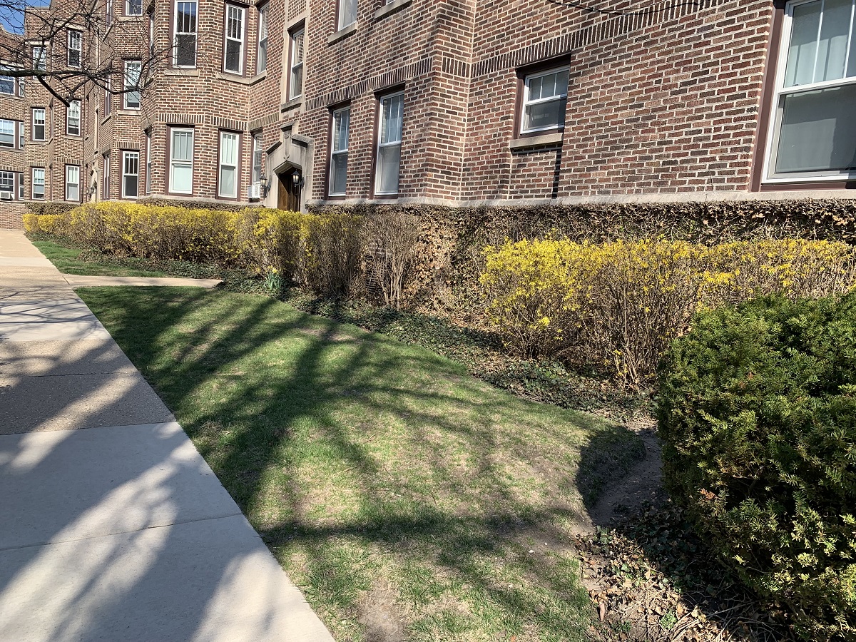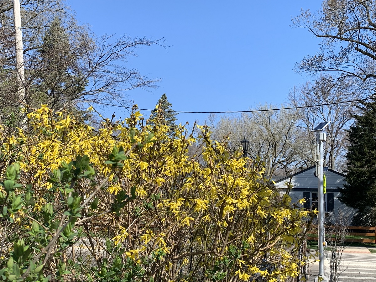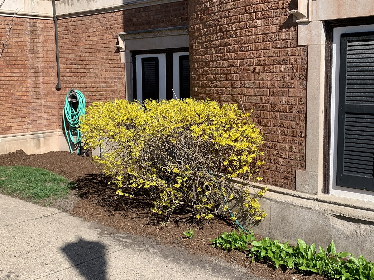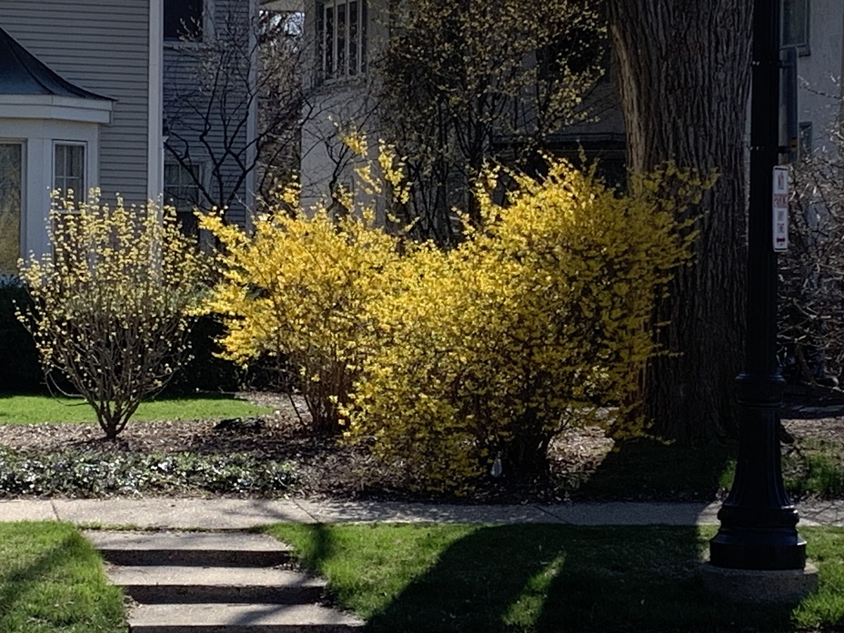 "Castle" condo with forsythia at Noyes and Sherman Ave.