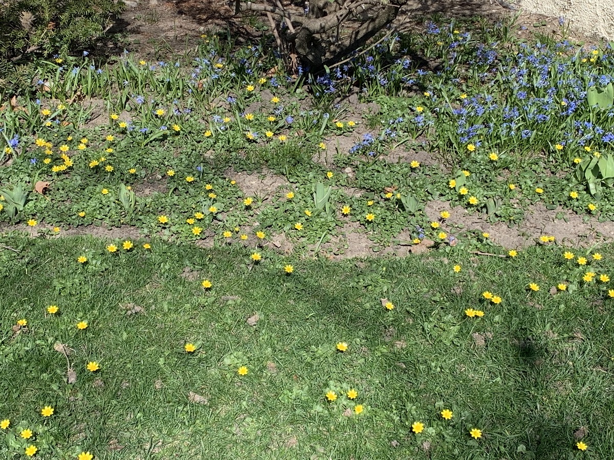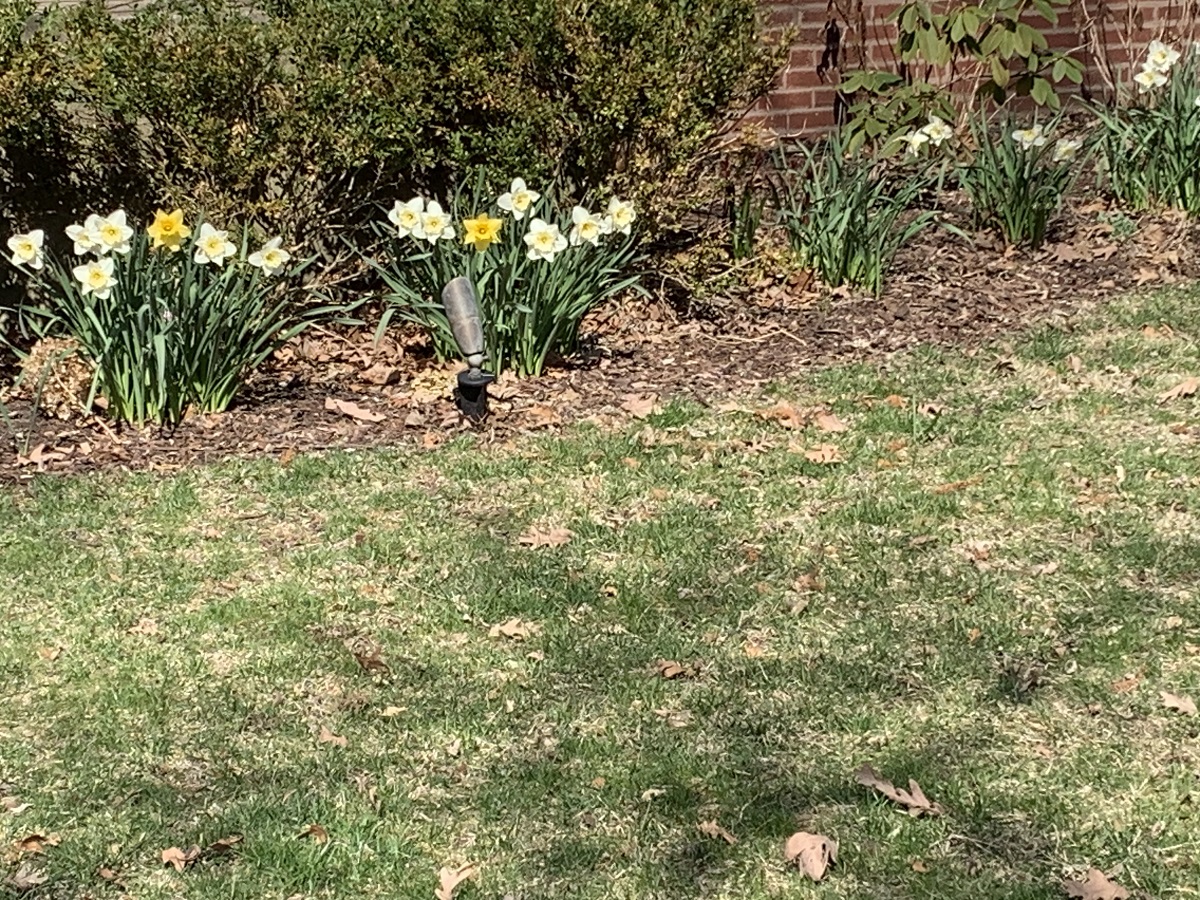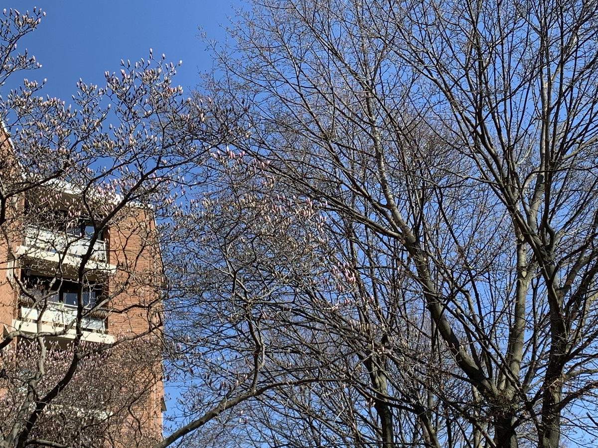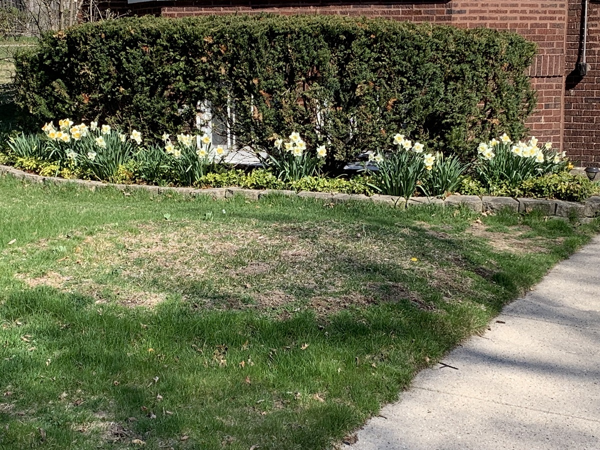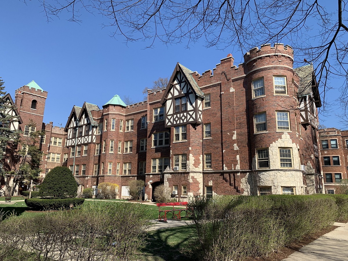 "Castle" condo with forsythia at Noyes and Sherman Ave.