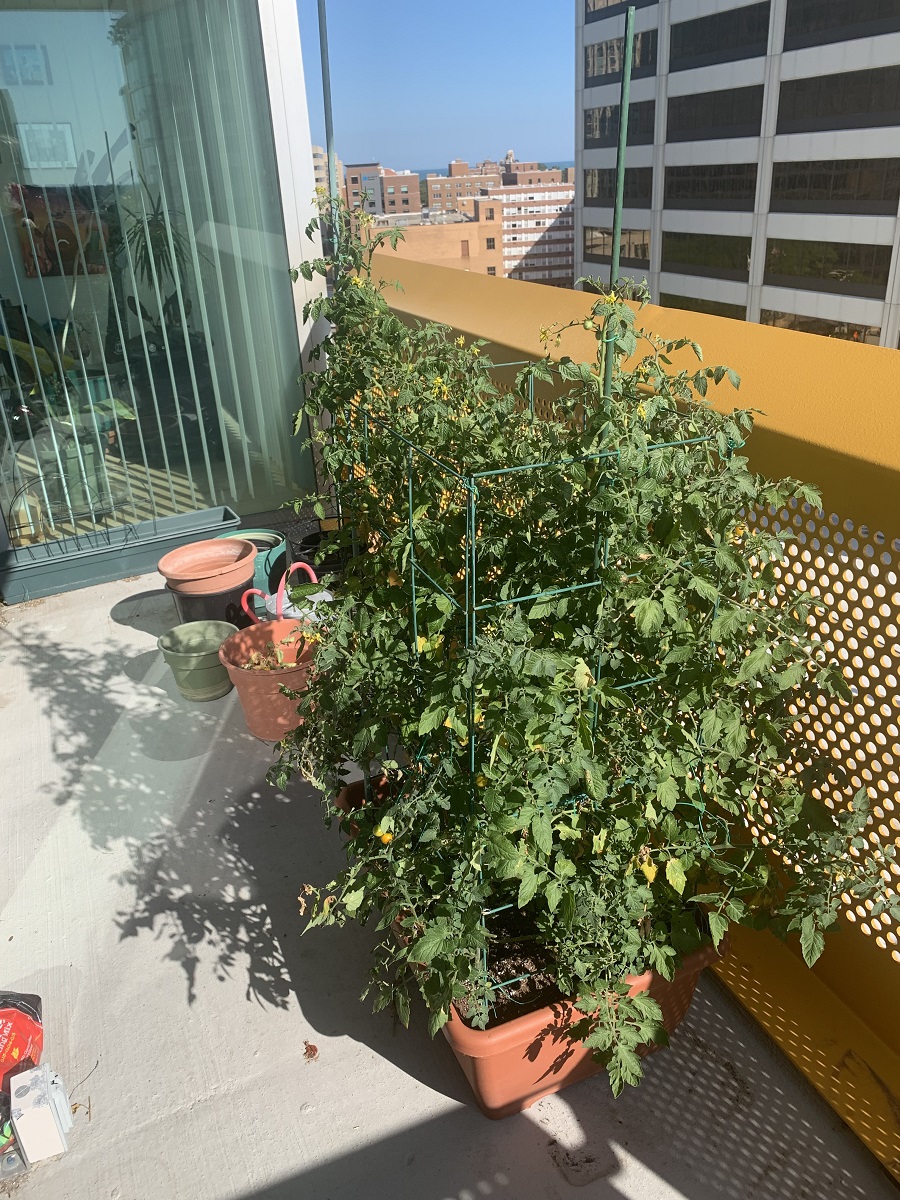 Cherry tomato plants a lot taller, over cage needing stake -- August 31, 2023