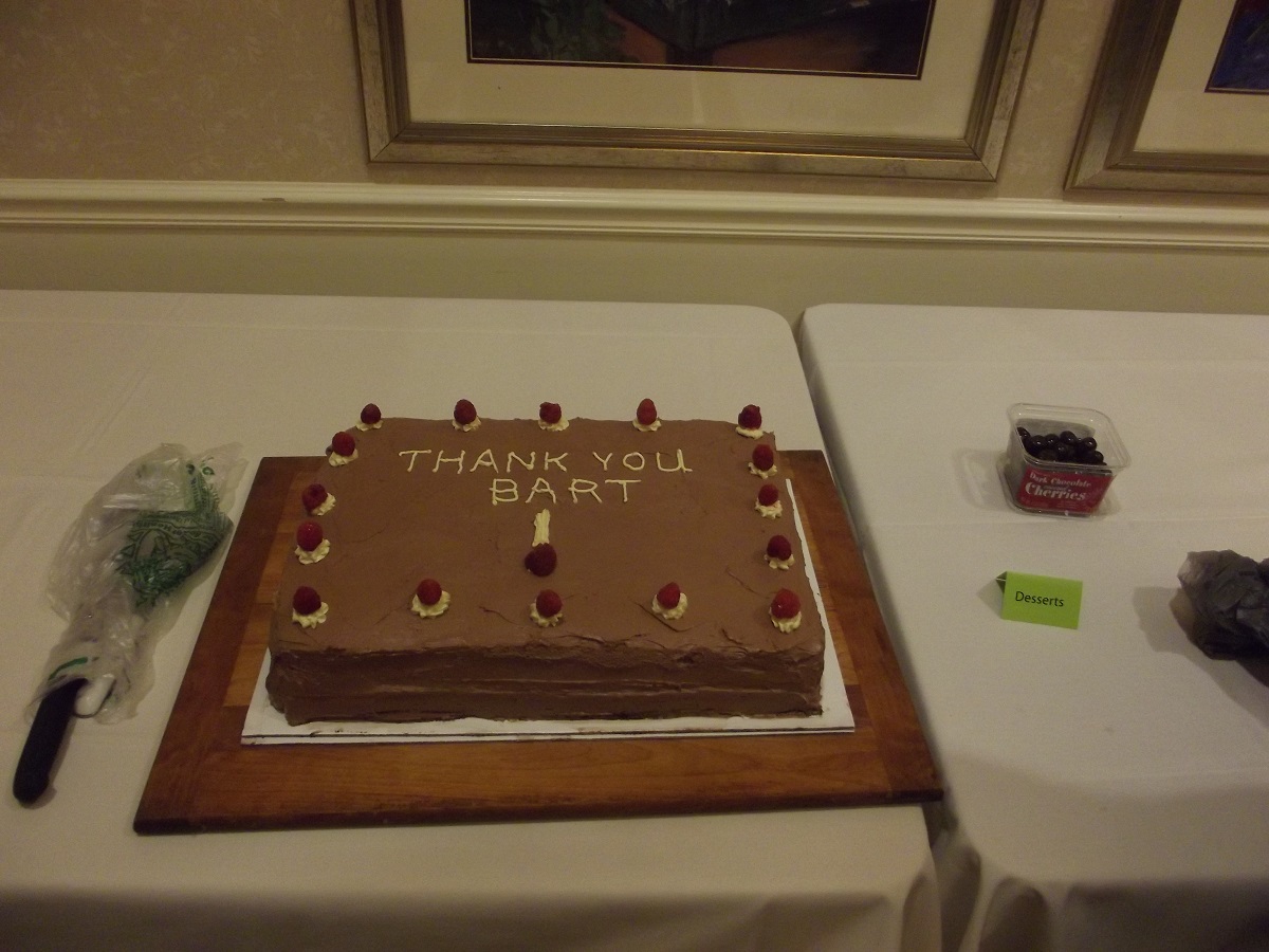 Huge, delicious 3-layer chocolate cake Luanne baked for Bart's party -- with rasberry decorations