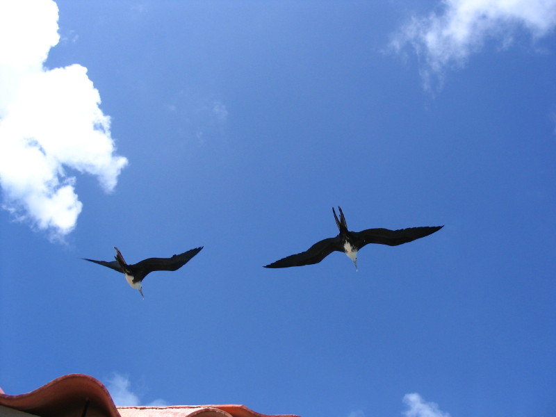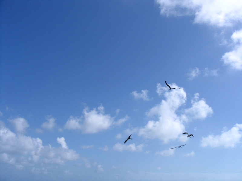 Many frigate birds comming to eat unwanted parts of fish