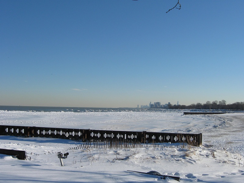 Downtown Chicago from NU landfill showing Lake Michigan with icebergs