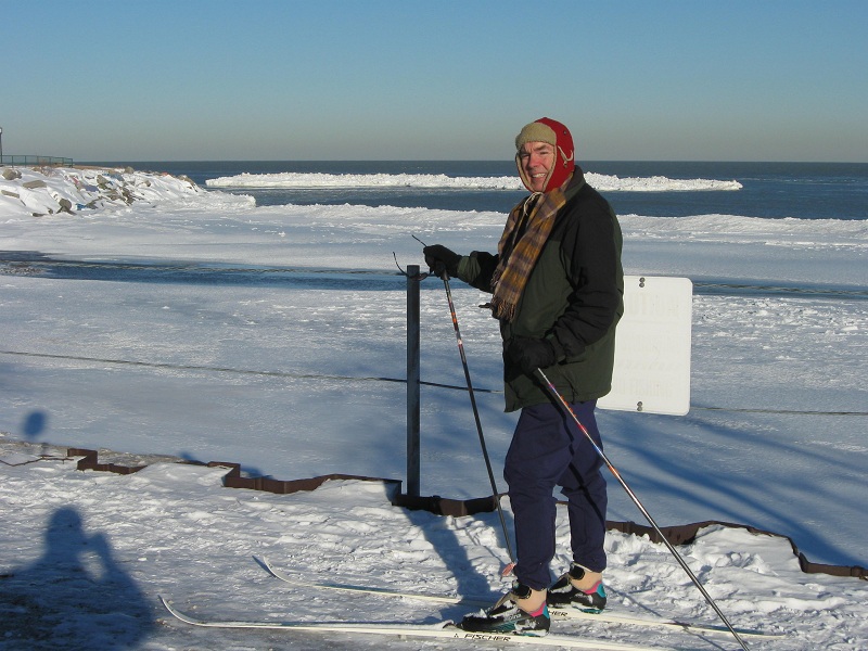 Andy XC skiing on NU landfill with huge iceberg on Lake Michigan
