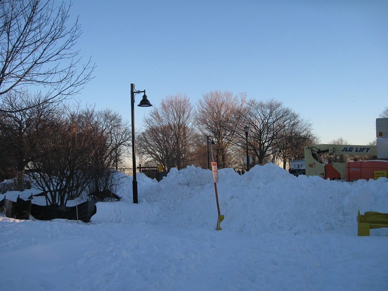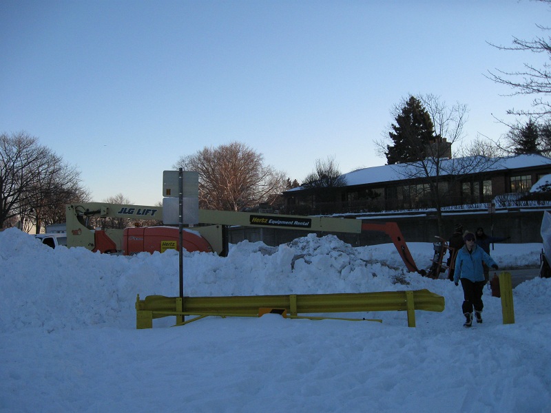 Farthest south showing huge snow piles by Dempster Street